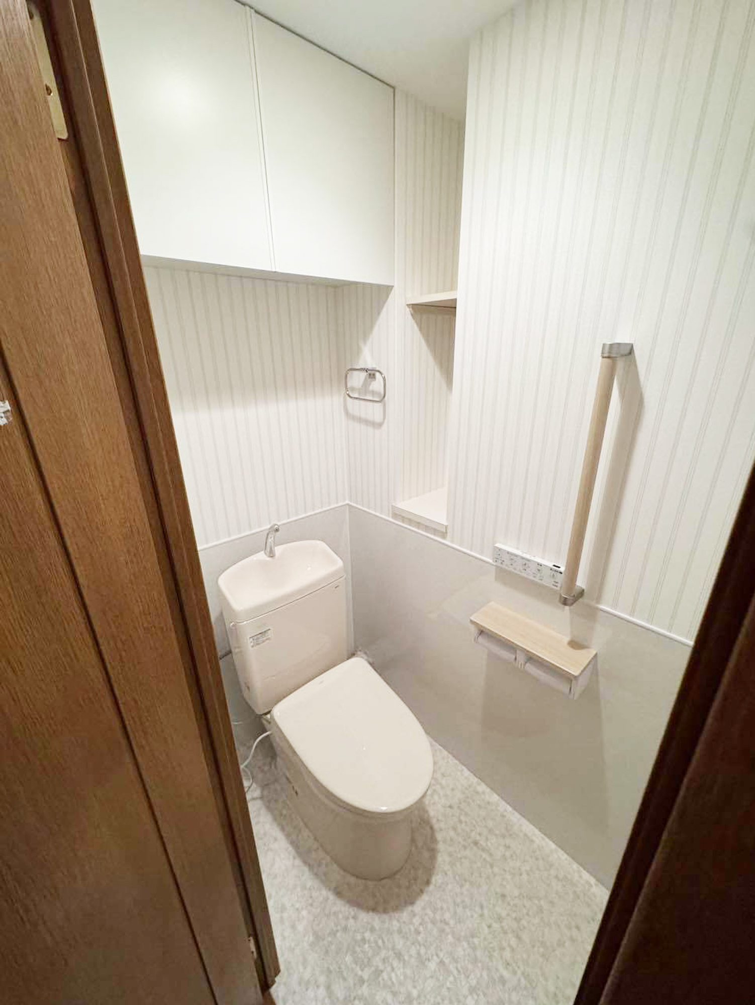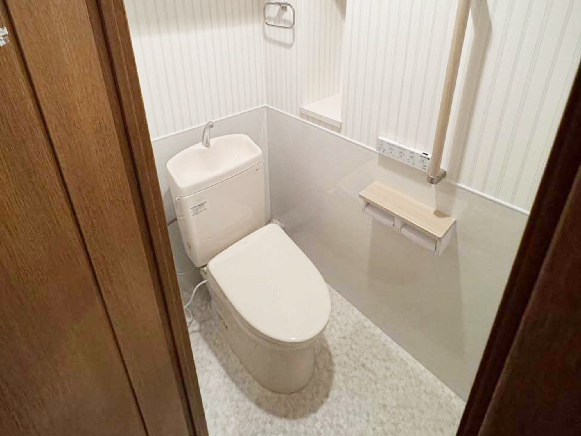 | 担当者からのひとこと | 清潔感のあるホワイトを基調に、ストライプ柄のクロスで空間にさりげないアクセントをプラス。さらに、ナチュラルな木目のカウンターや手すりを取り入れることで、やわらかく落ち着いた雰囲気に仕上げました。便器はコンパクトながらもしっかりとした洗浄力を備えており機能性と清潔感を兼ね備えたトイレへと生まれ変わりました。 |