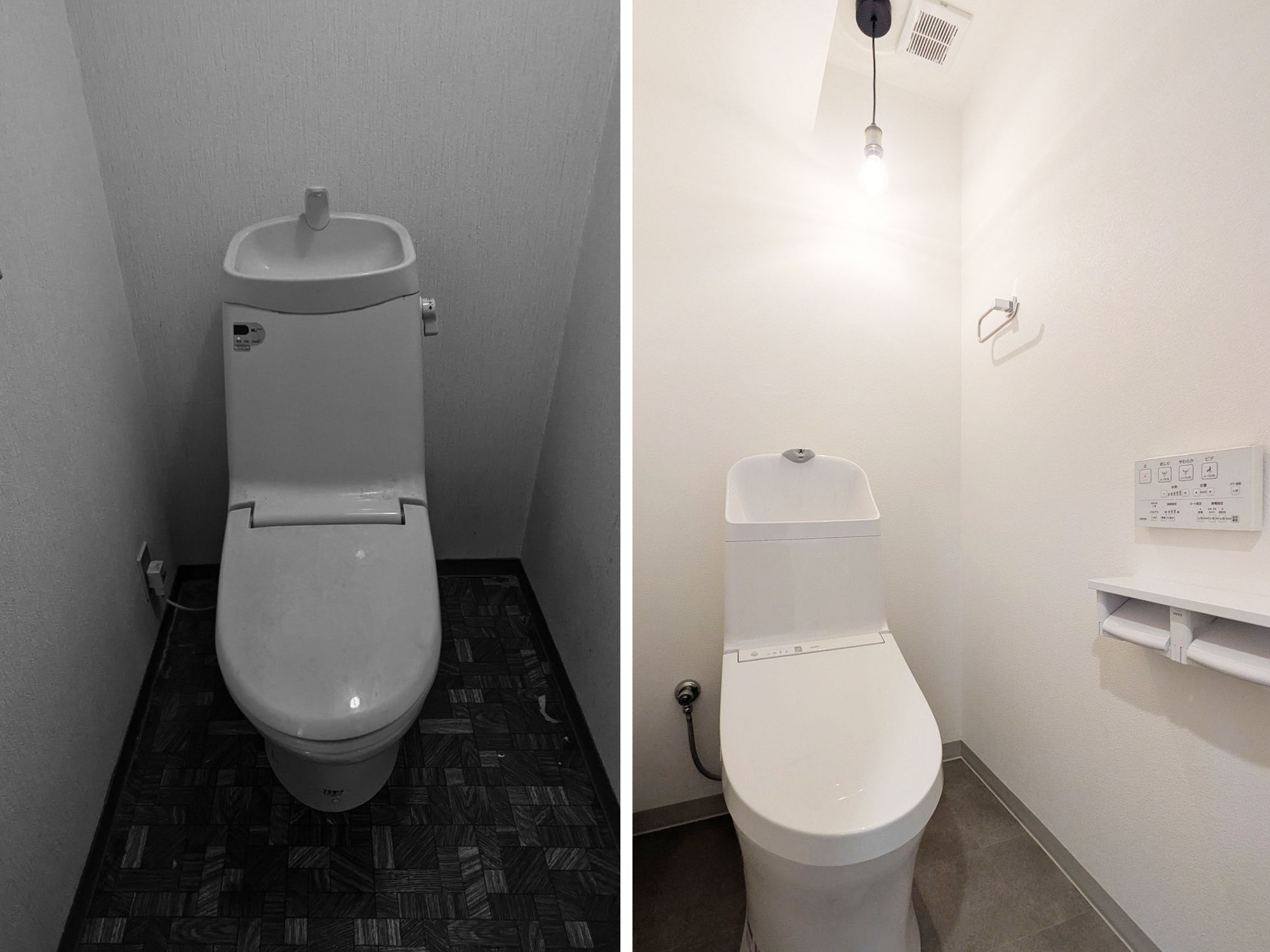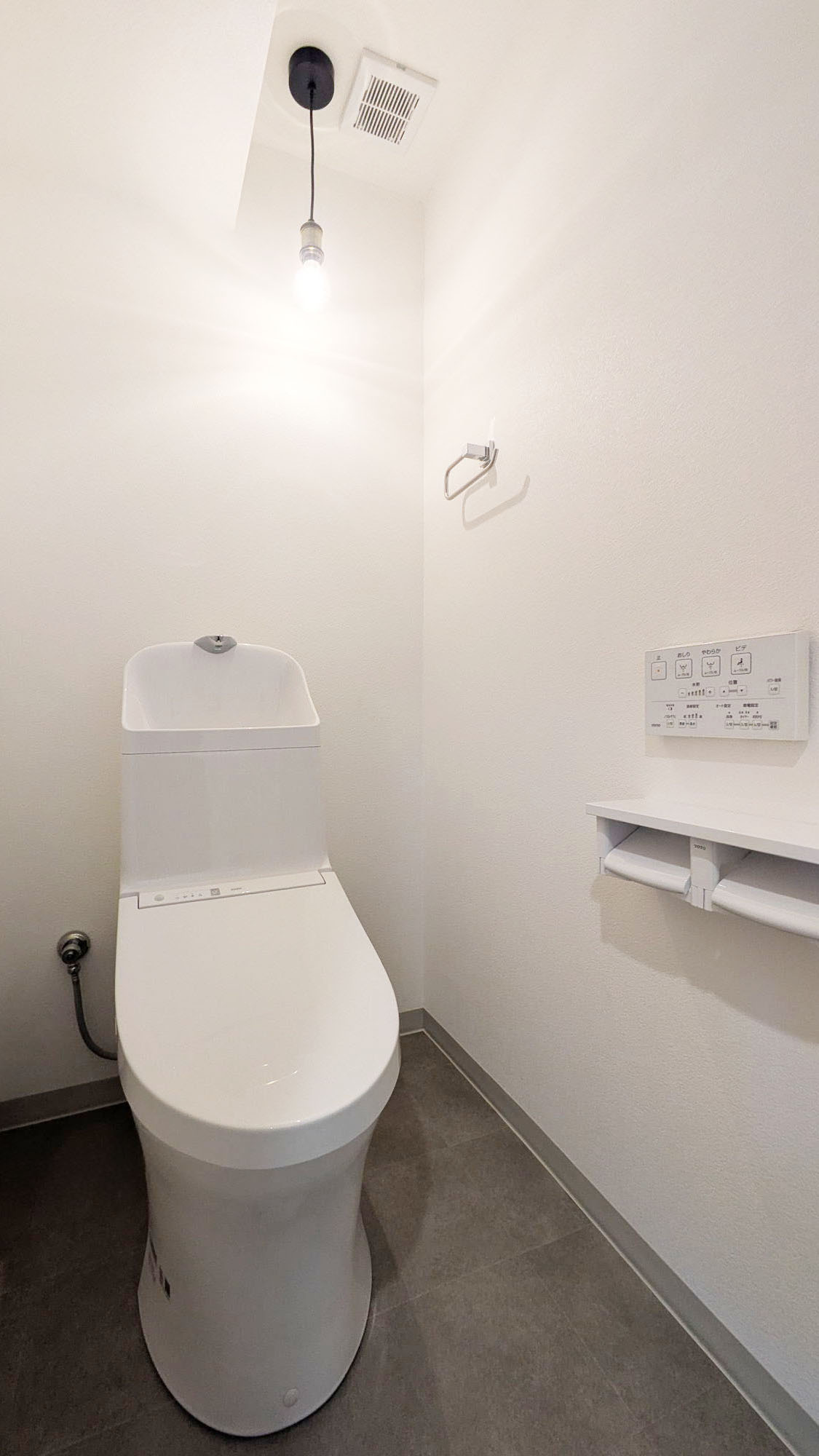 【トイレ】使用材料 メーカー:TOTO 商品名:ウォシュレット一体形便器ZR1(手洗い付き) 【タオル掛け】 メーカー:TOTO 商品名:YT408R 【棚付き二連紙巻器】 メーカー:TOTO 商品名:YH650 【ペンダントライト】 メーカー:Panasonic 商品名:LGB15802/天井吊下型 LED(電球色) ペンダント直付タイプ