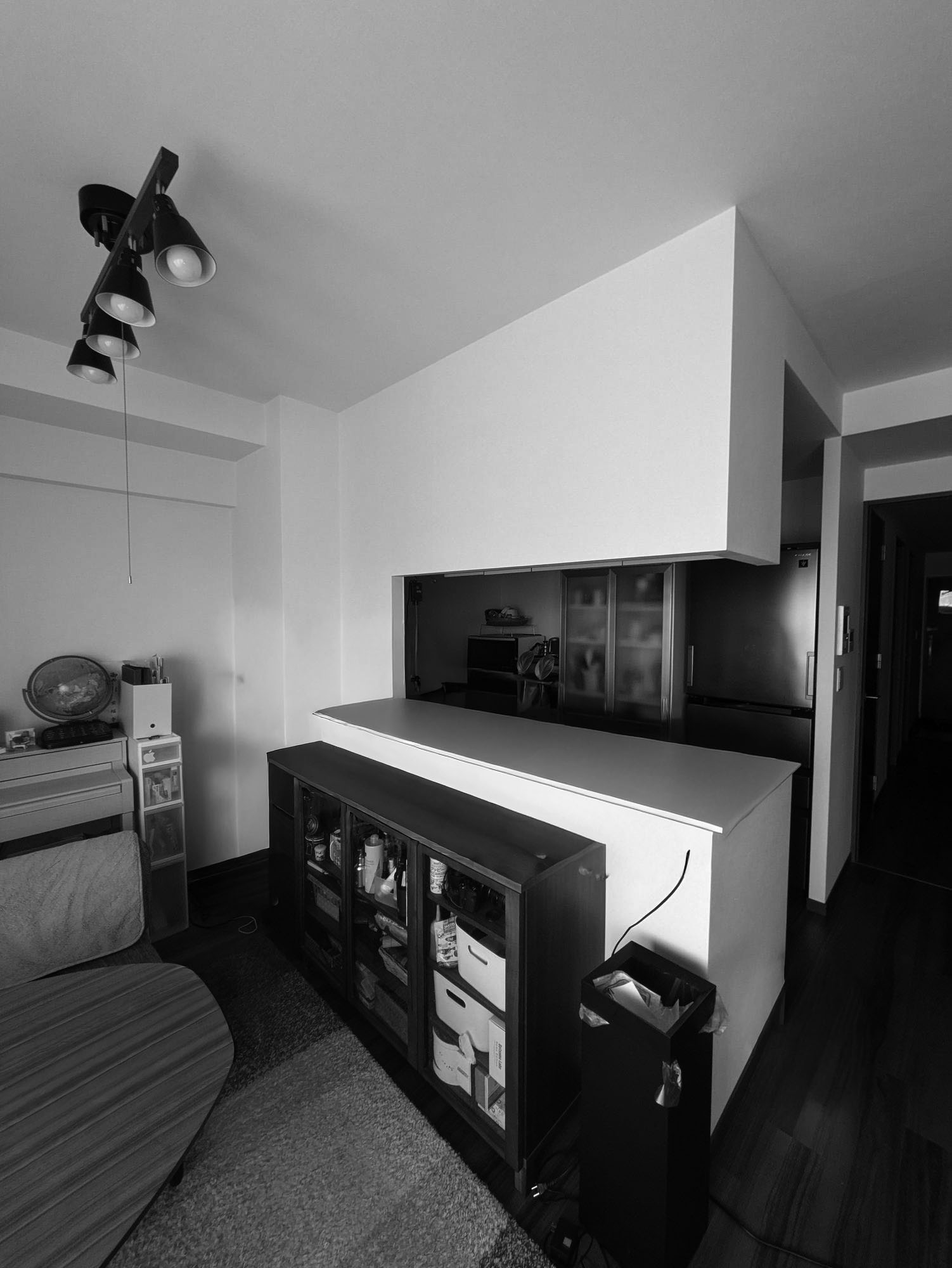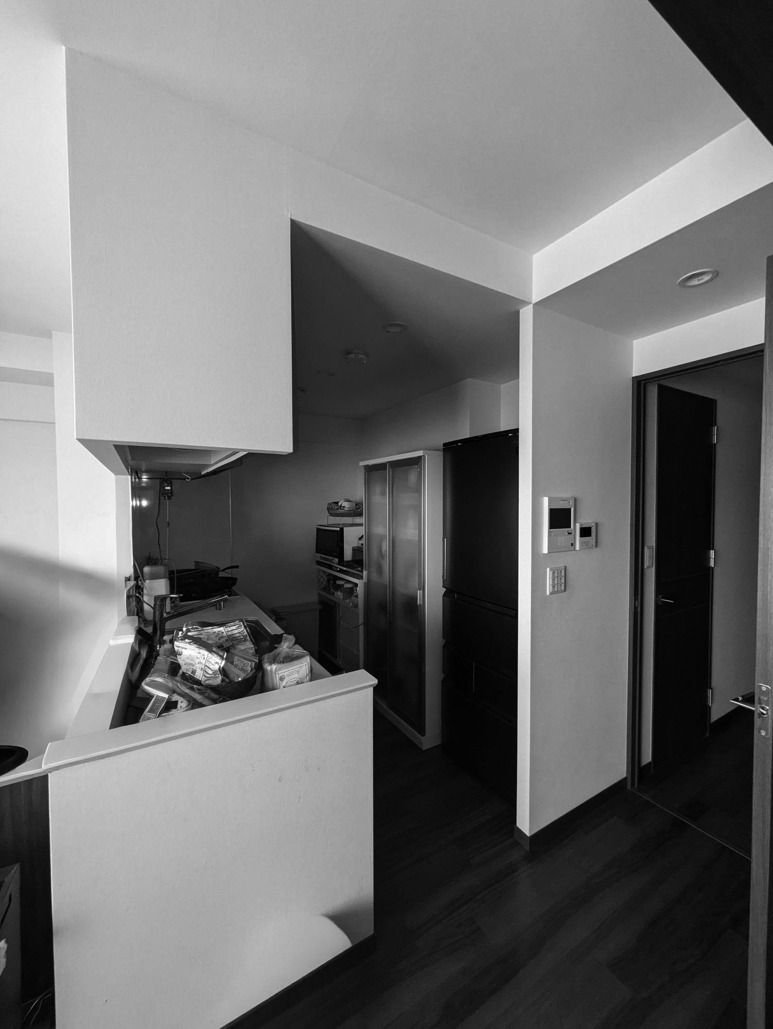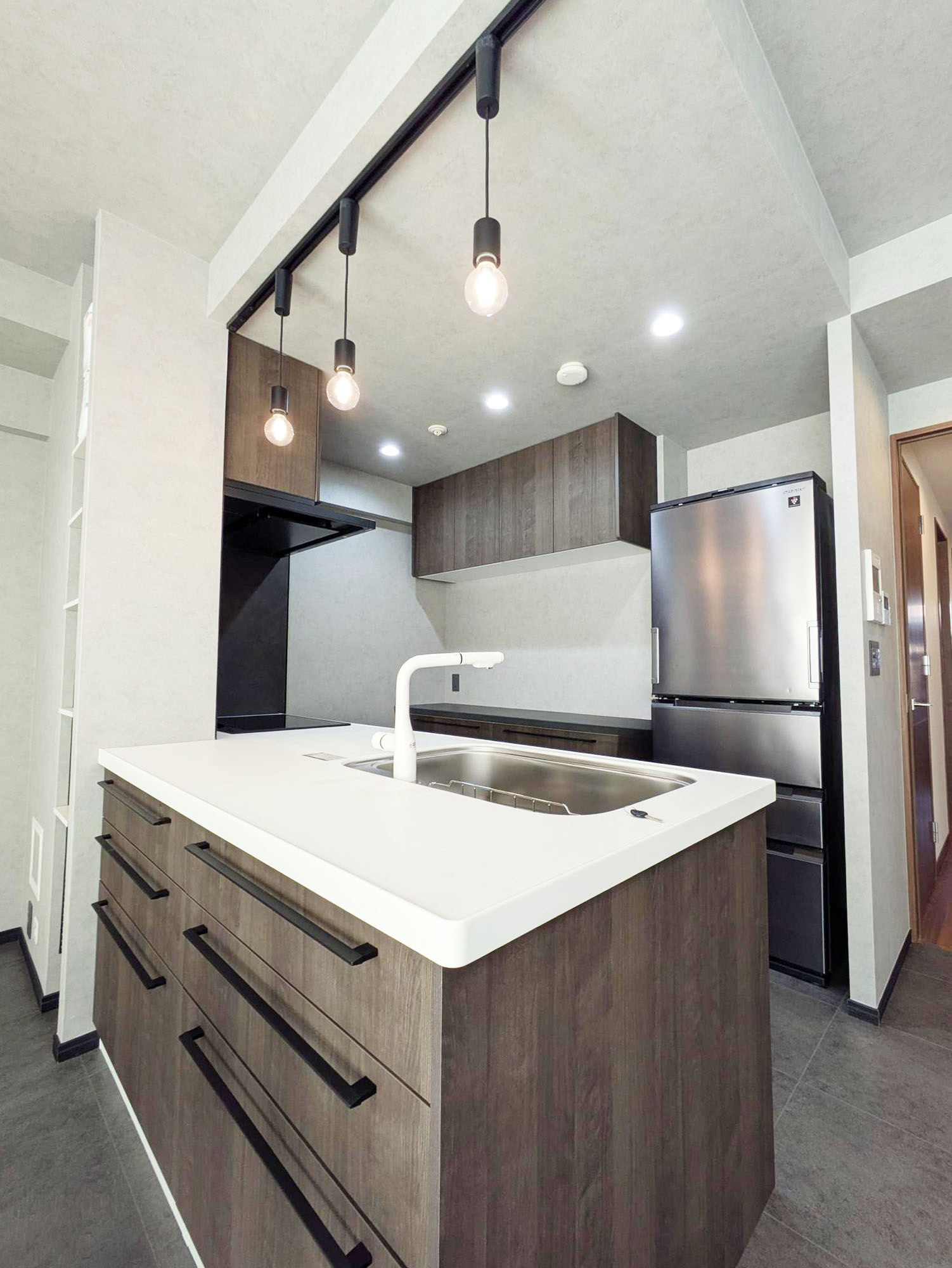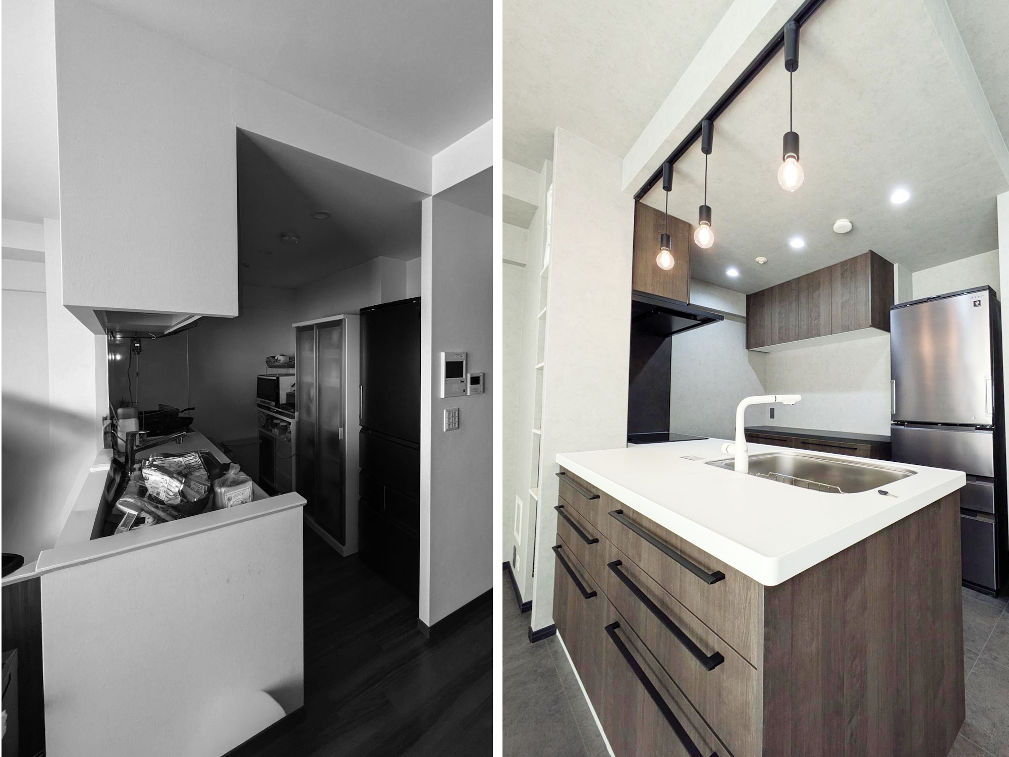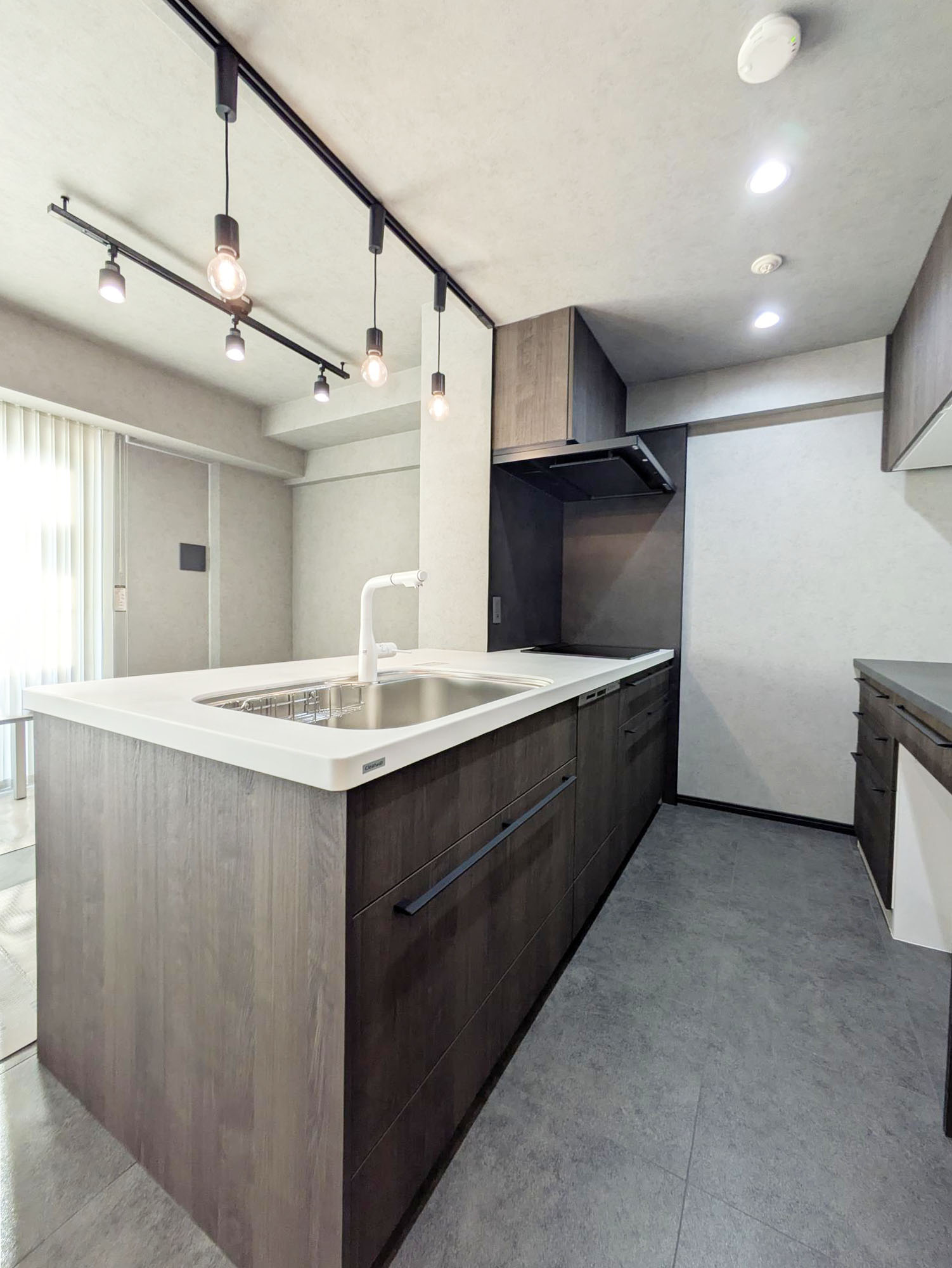吊戸棚と壁を撤去したことで、閉鎖的だったキッチンが一変。カップボードもキッチンと同じシリーズで揃え、インテリアの主役となる素敵な空間に生まれ変わりました。内装も一新し、スタイリッシュなフロアタイルの床が、空間全体の印象をより引き立てています。 コンロ周りは掃除のしやすさを考えて、IHクッキングヒーターと、キッチンに合わせたダークカラーの「クリン壁パネル」を採用し、見た目もすっきりと仕上がりました。人気の「洗エール レンジフード」は、フィルターとファンのお掃除が2ヶ月に1回ボタンを押すだけでOK。簡単にお手入れできるのも嬉しいポイントです。