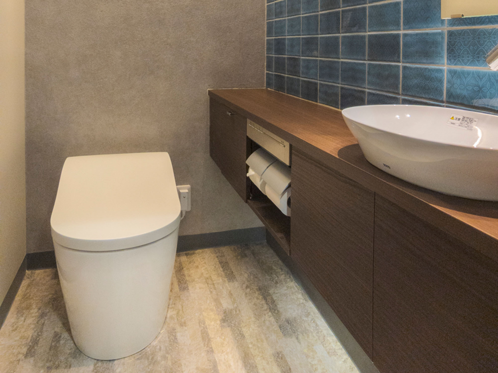 | 使用材料 | 【レストルーム】TOTO ネオレストLS / 【手洗い・キャビネット】TOTO レストルームドレッサー プレミアムシリーズ フローティングデザインキャビネット (カウンター色:ダルブラウン) /【タイル】ニッタイ ミント MNT-755D-75 /【照明】KOIZUMI LEDスリム間接ブラケット |