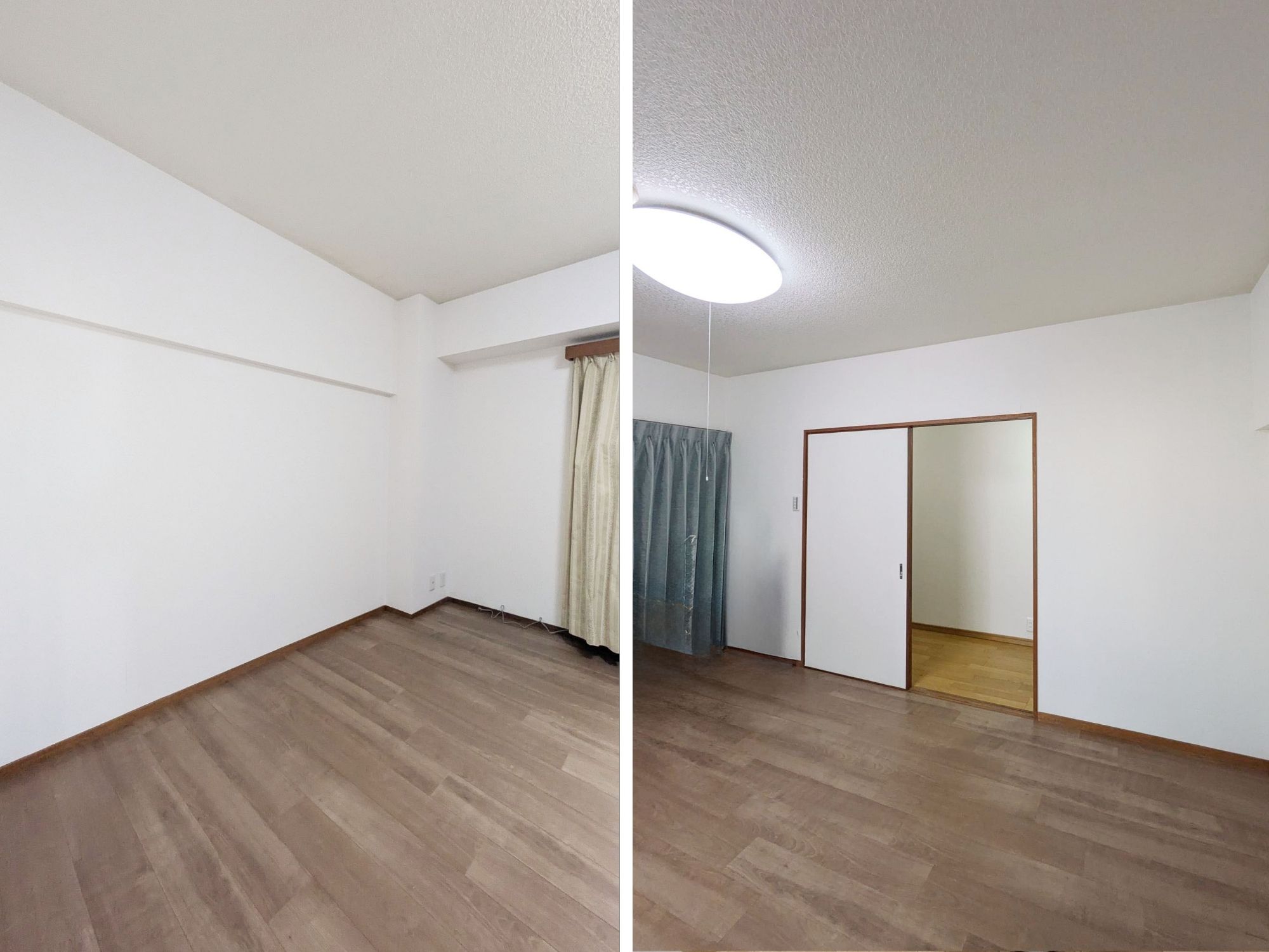 今回の床張り替えでは、階下への音を軽減する高い遮音性能を備えたフローリングを採用し、階下への安心感を向上させました。また、窓辺には上質で洗練されたグリーンのオーダーカーテンを設置。機能性とデザイン性を両立した、静かで心地よい居室空間が実現しました。