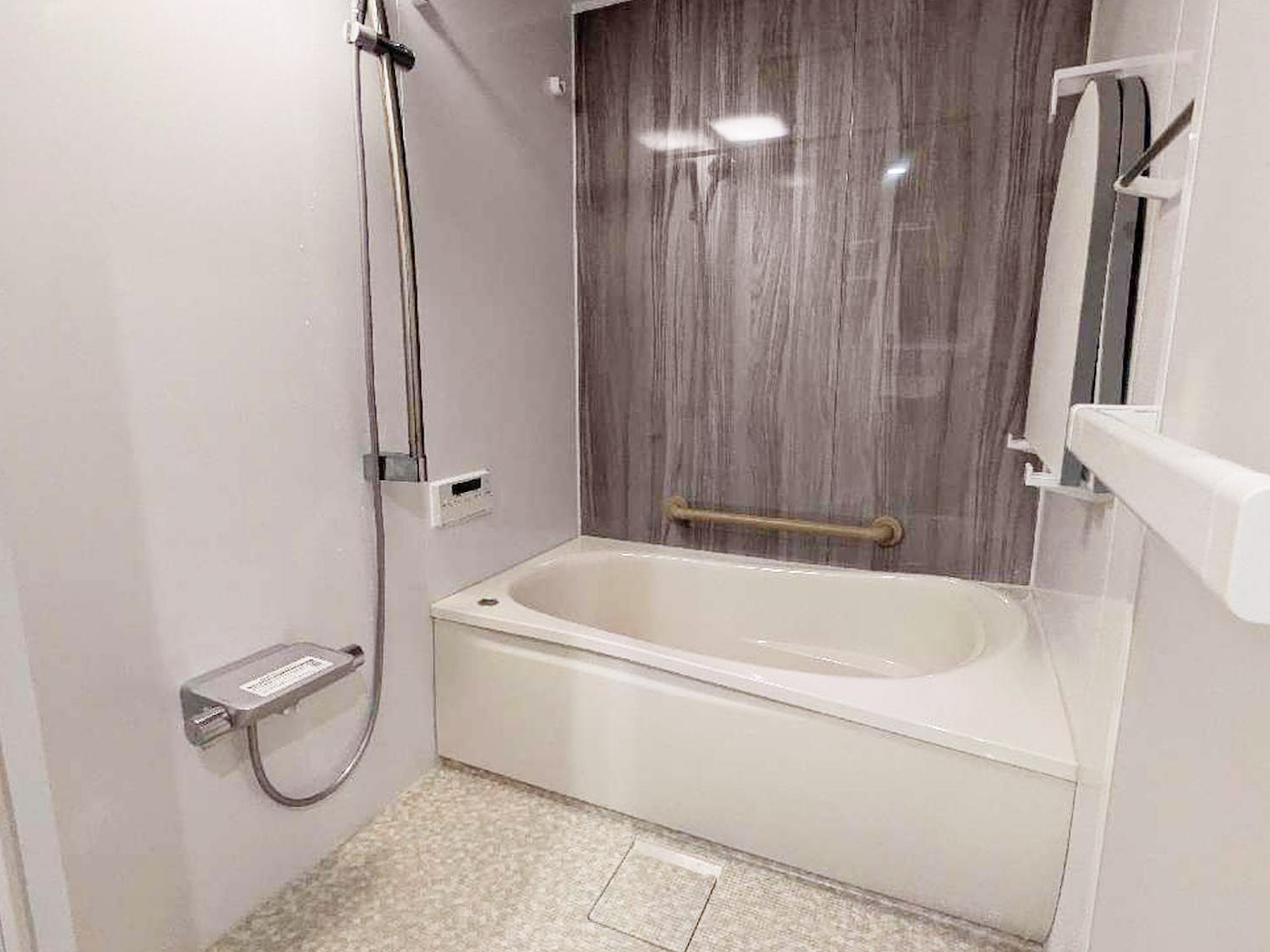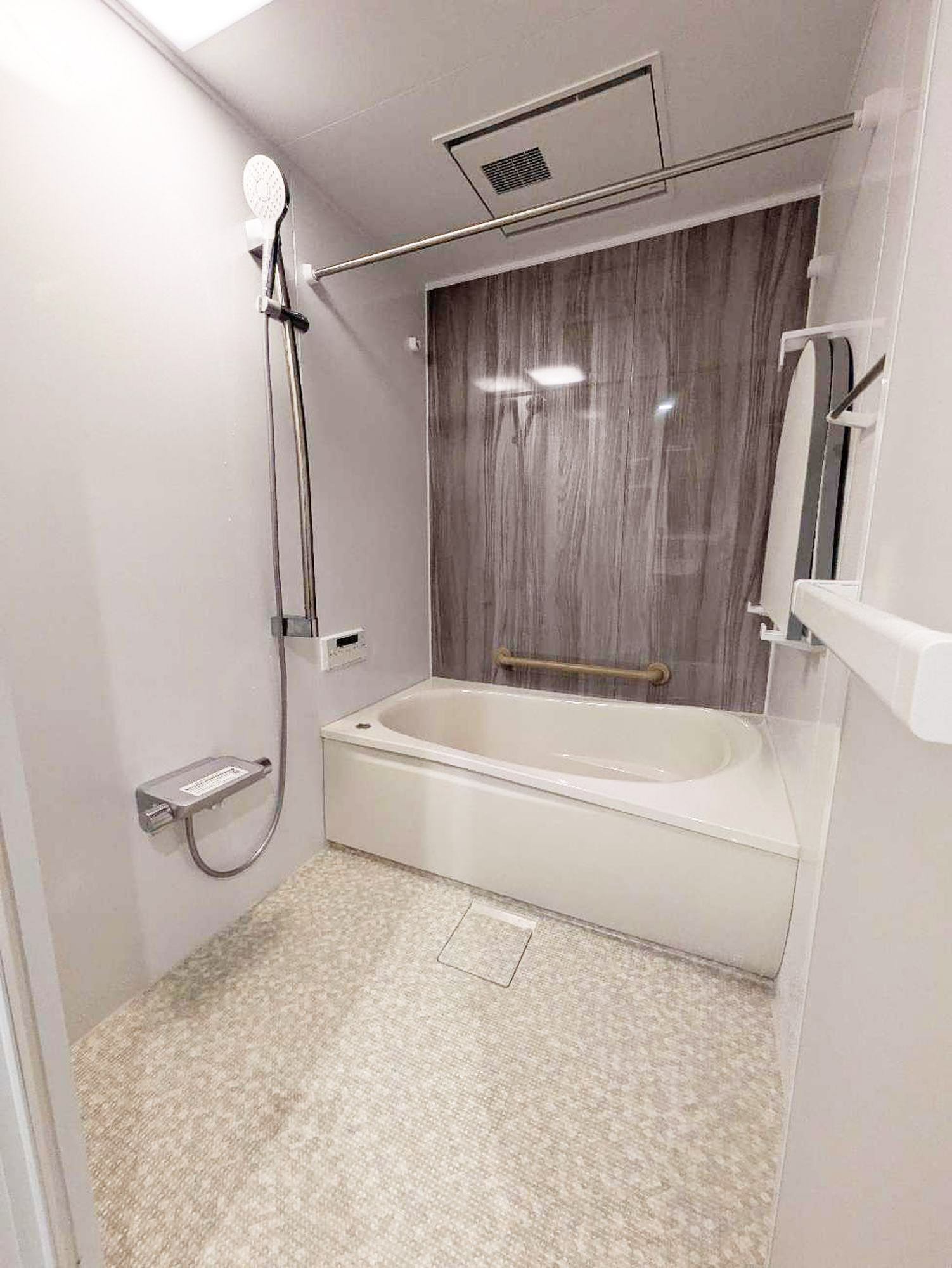 快適性と使いやすさを高めたシステムバスへ入れ替えました。やわらかな踏み心地で滑りにくい床や、お手入れのしやすい設備を採用し、毎日気持ちよく使える空間に。アクセントには木目調の壁パネルを取り入れ、浴室全体にあたたかみとやさしい雰囲気をプラスしました。機能性とデザイン性を兼ね備えた、心地よくくつろげるバスルームが完成しました。