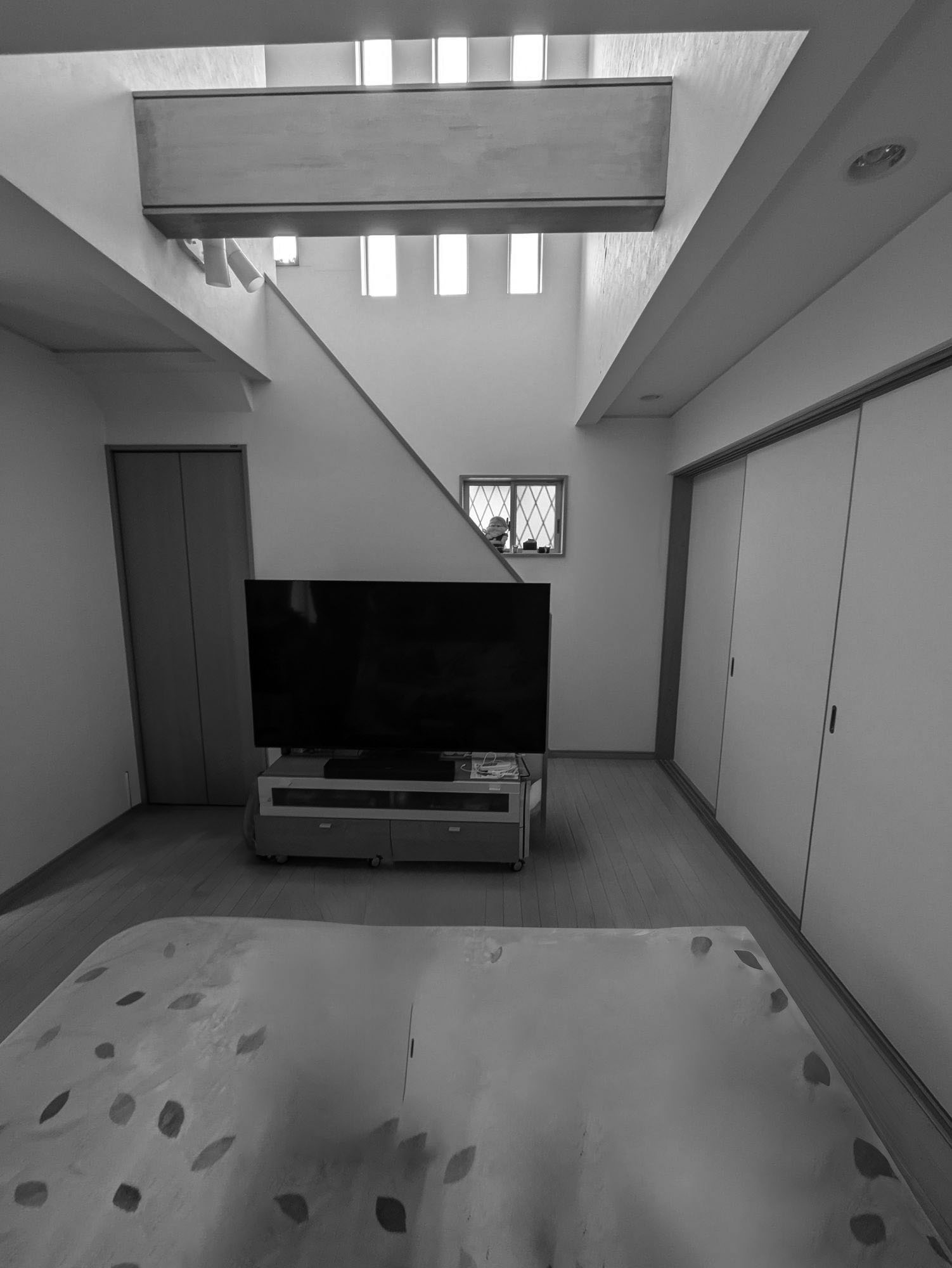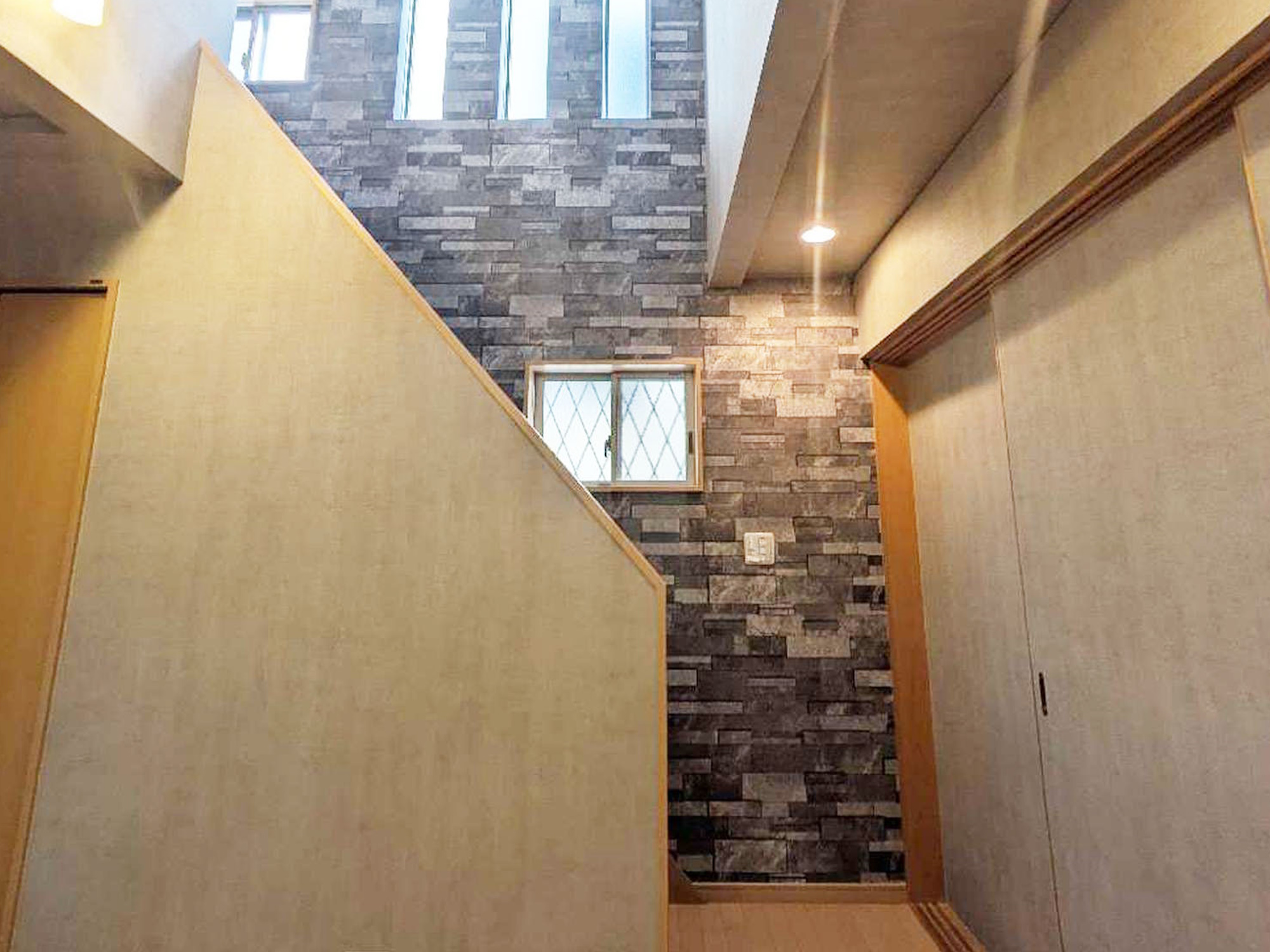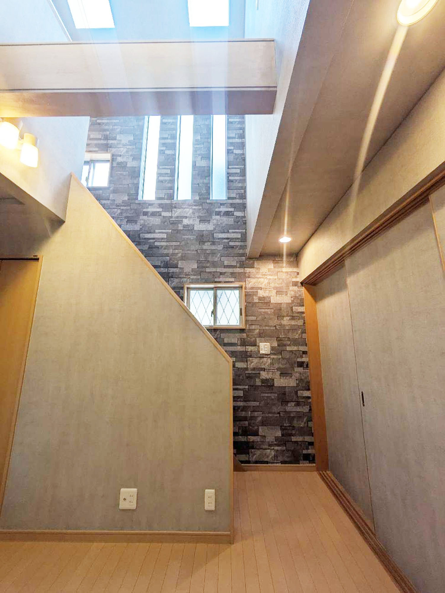 クロスの貼り替えを行い、空間全体を落ち着いた雰囲気へとリフレッシュしました。壁一面にはグレーの石目調アクセントクロスを採用し、上質でモダンな印象に。その他の部分は薄いグレーでまとめ、全体のトーンに統一感を持たせています。クロスの変更によって吹き抜けの開放感がより際立ち、明るく伸びやかな空間が生まれました。