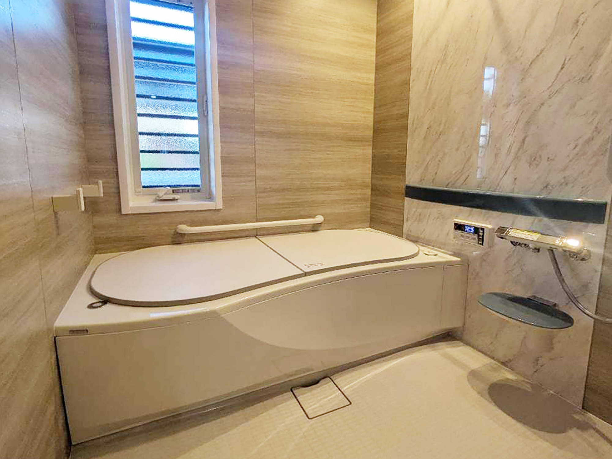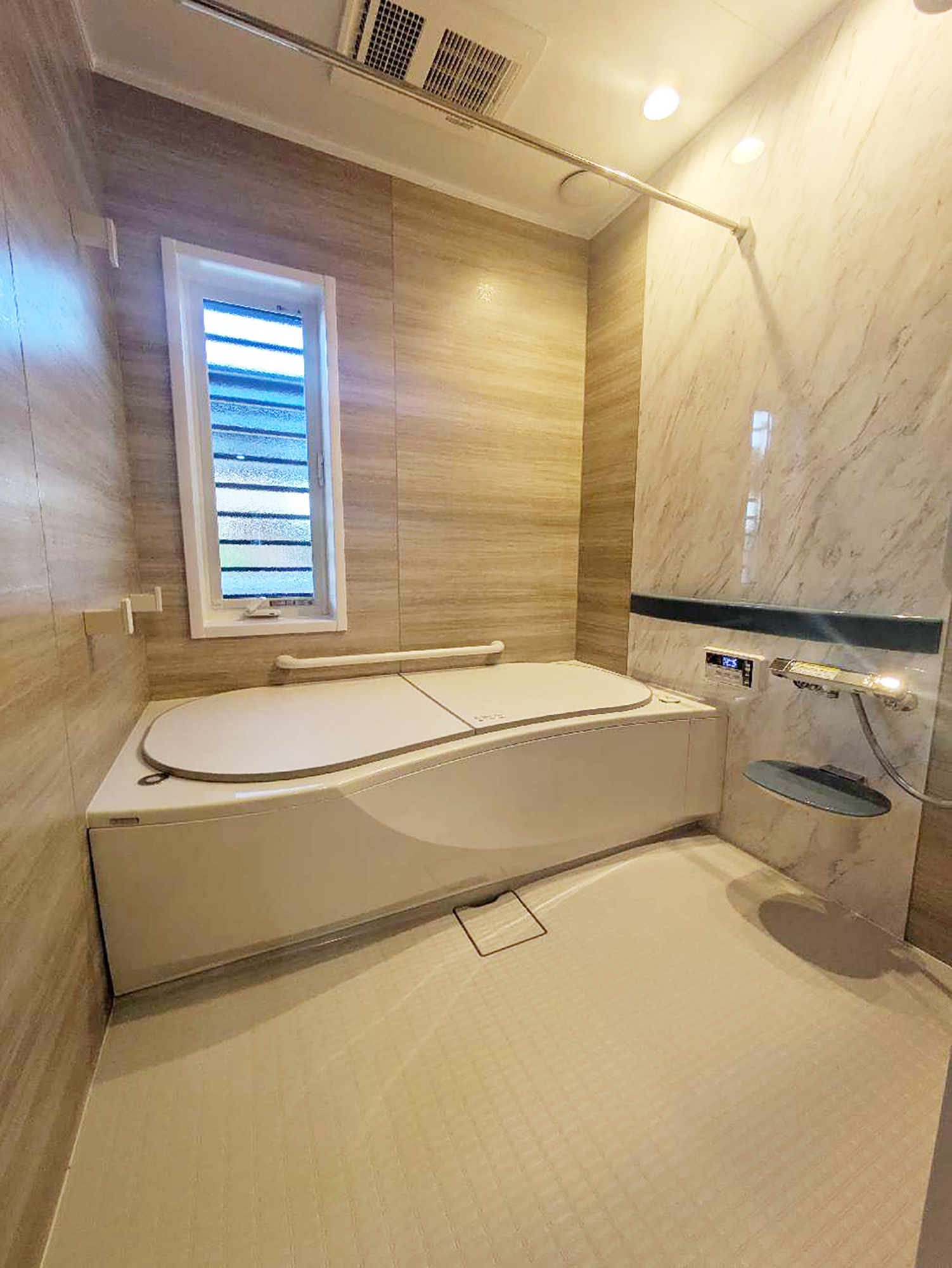 | 担当者からのひとこと | 白い大理石調の壁と、明るい木目のアクセントでまとめた上質なバスルームです。全体が明るく、あたたかみのあるデザインでありながら、落ち着きと上品さを感じられる空間に仕上がっています。今回採用したバスルームは、メーカーの上位クラスにあたるモデルで、素材の質感や意匠性、使い心地を細部まで追求した仕様が特長です。ゆったりとした浴槽やお手入れしやすい設備など、毎日の入浴時間をより快適にしてくれるこだわりが随所に感じられます。明るい印象と高級感を両立した、ワンランク上のバスルーム空間となりました。 |