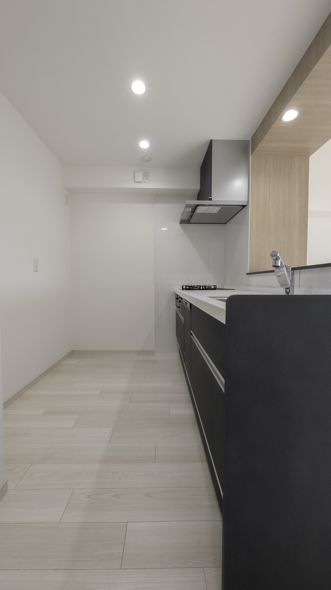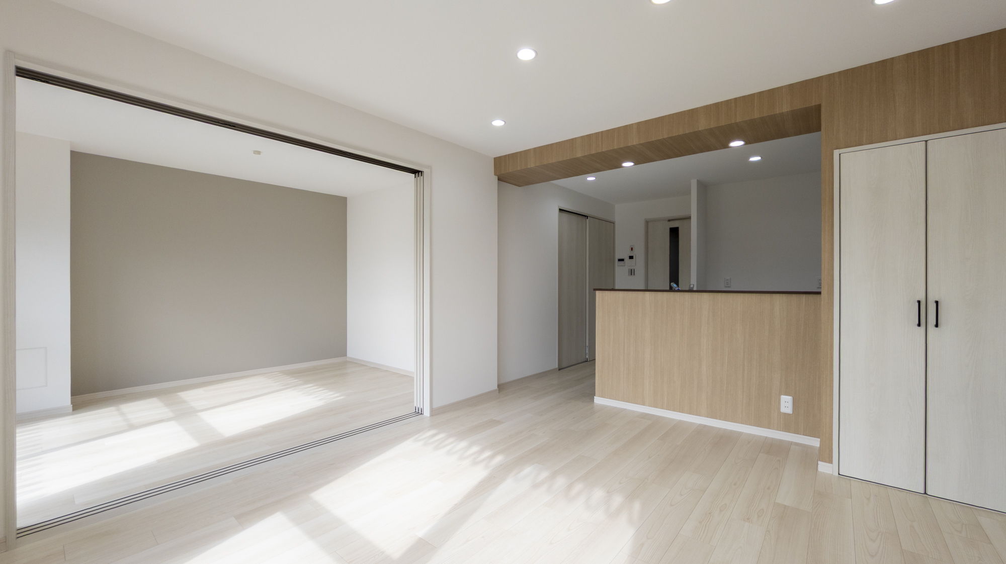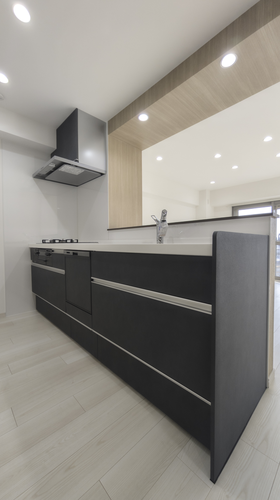 | 担当者からのひとこと | 傷みの目立つ築約50年のマンションをリモデル。明るい空間にキッチンの濃い色味がアクセントとして映え、洗練された印象を演出。ニュートラルな内装は、どんな家具とも美しく調和します。また、大胆な間取り変更によりウォークスルー動線を実現し、風が通り抜ける開放感と家族の繋がりを両立。機能美と心地よさを兼ね備えた、空間全体を上質な空間へと一新しました。 |