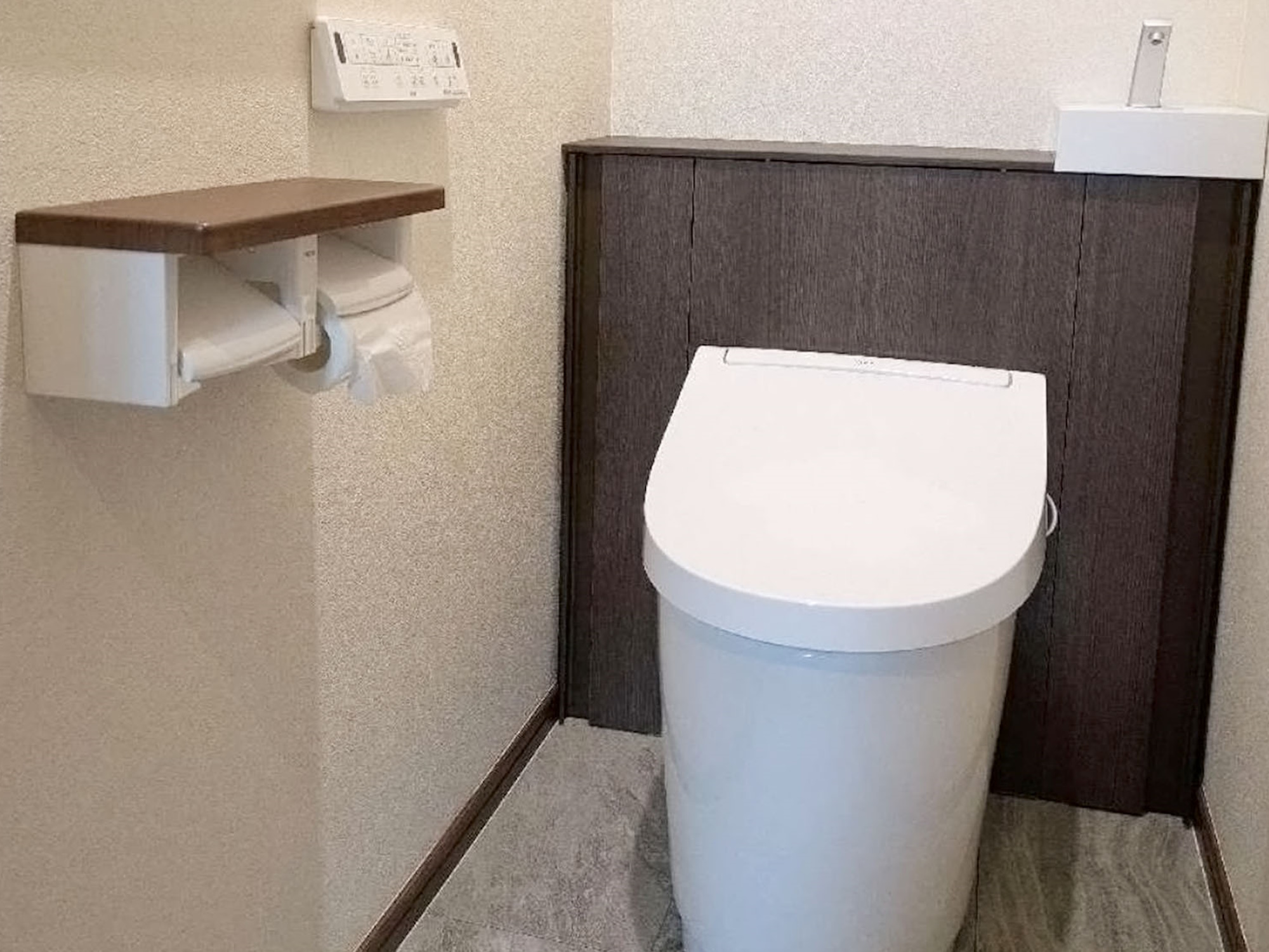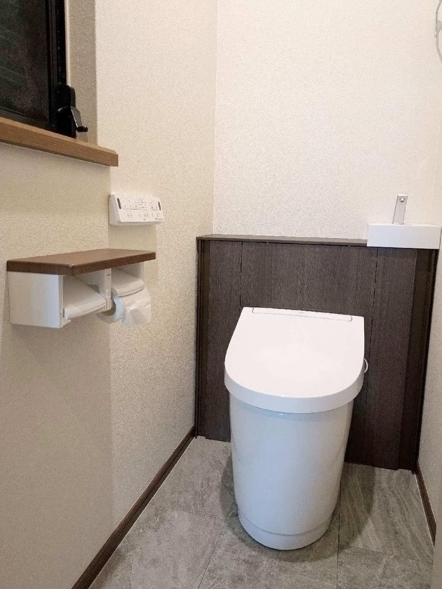 最新機種のキャビネット型トイレに入れ替えた今回のリフォーム。収納機能が一体化したすっきりとしたデザインで、生活感を抑えた整った空間に生まれ変わりました。濃いブラウンを取り入れ、落ち着いた雰囲気を演出。上質さと温かみが感じられるトイレとなり、毎日使う空間に心地よさがプラスされました。