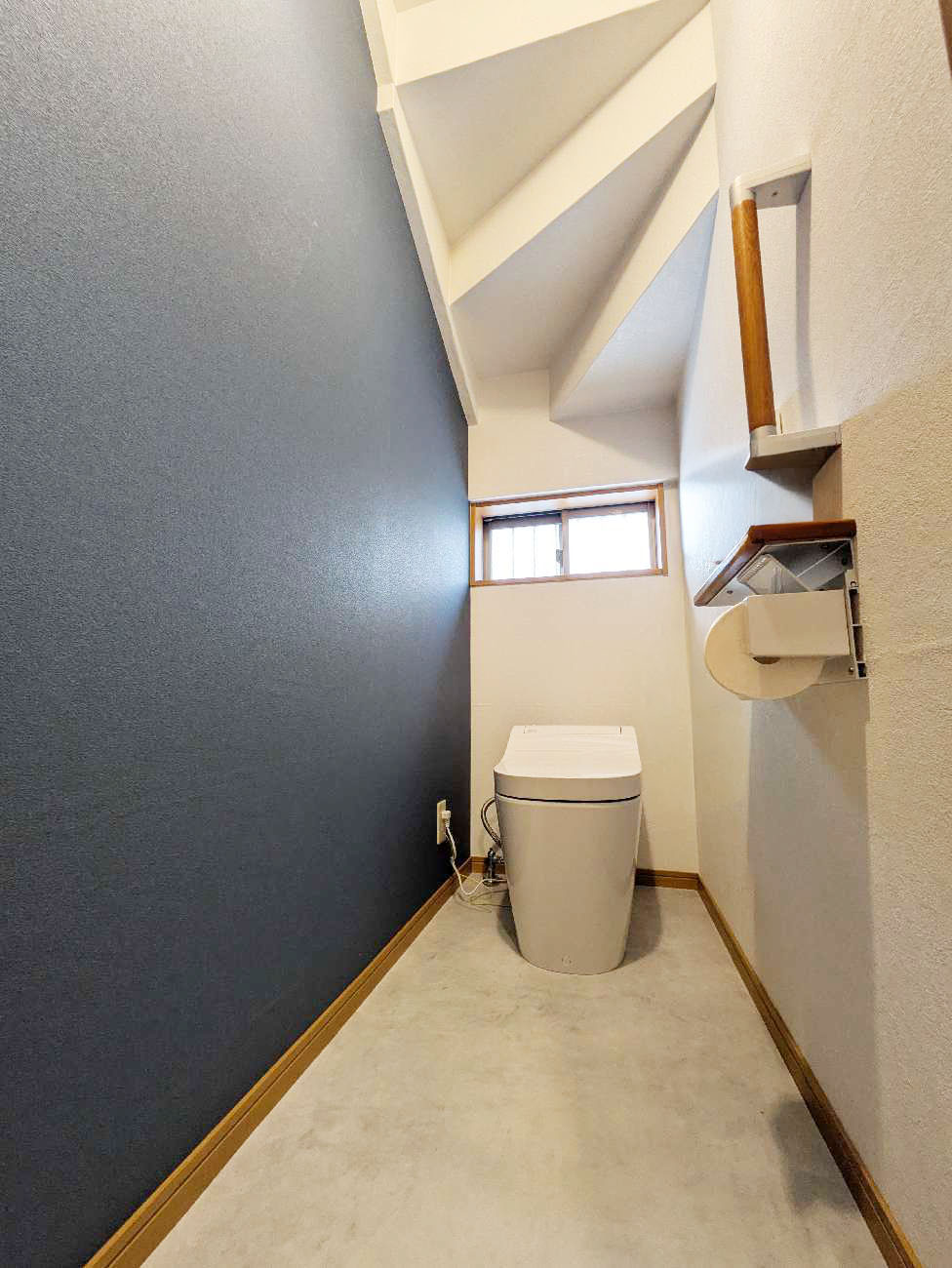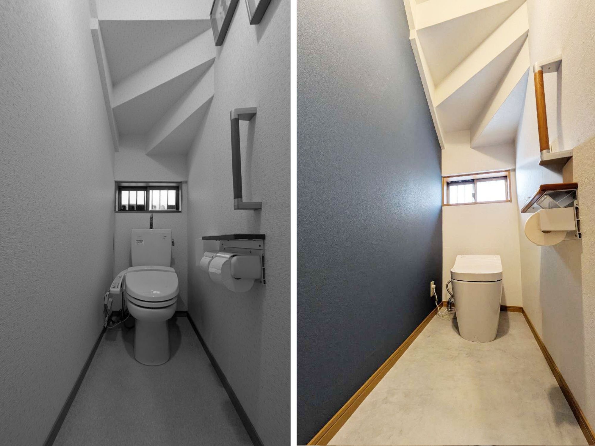 シンプルなトイレから、内装と機能の両面で劇的にイメージチェンジしました。正面に個性的なアクセントクロスを取り入れたことで、空間に奥行きとモダンな雰囲気を与えています。毎日使う場所だからこそ、心まで明るくなるような心地よい空間を実現することができました。