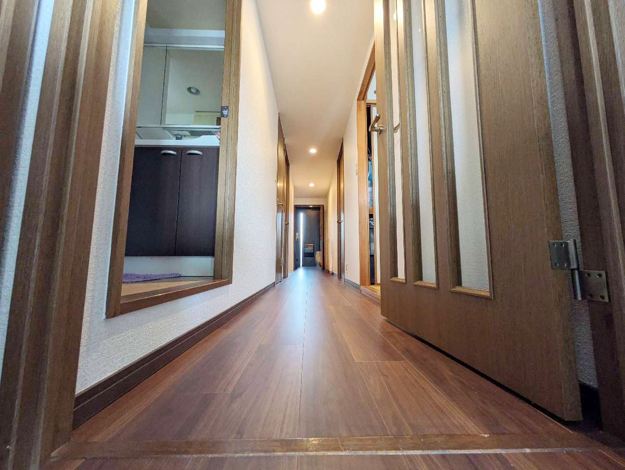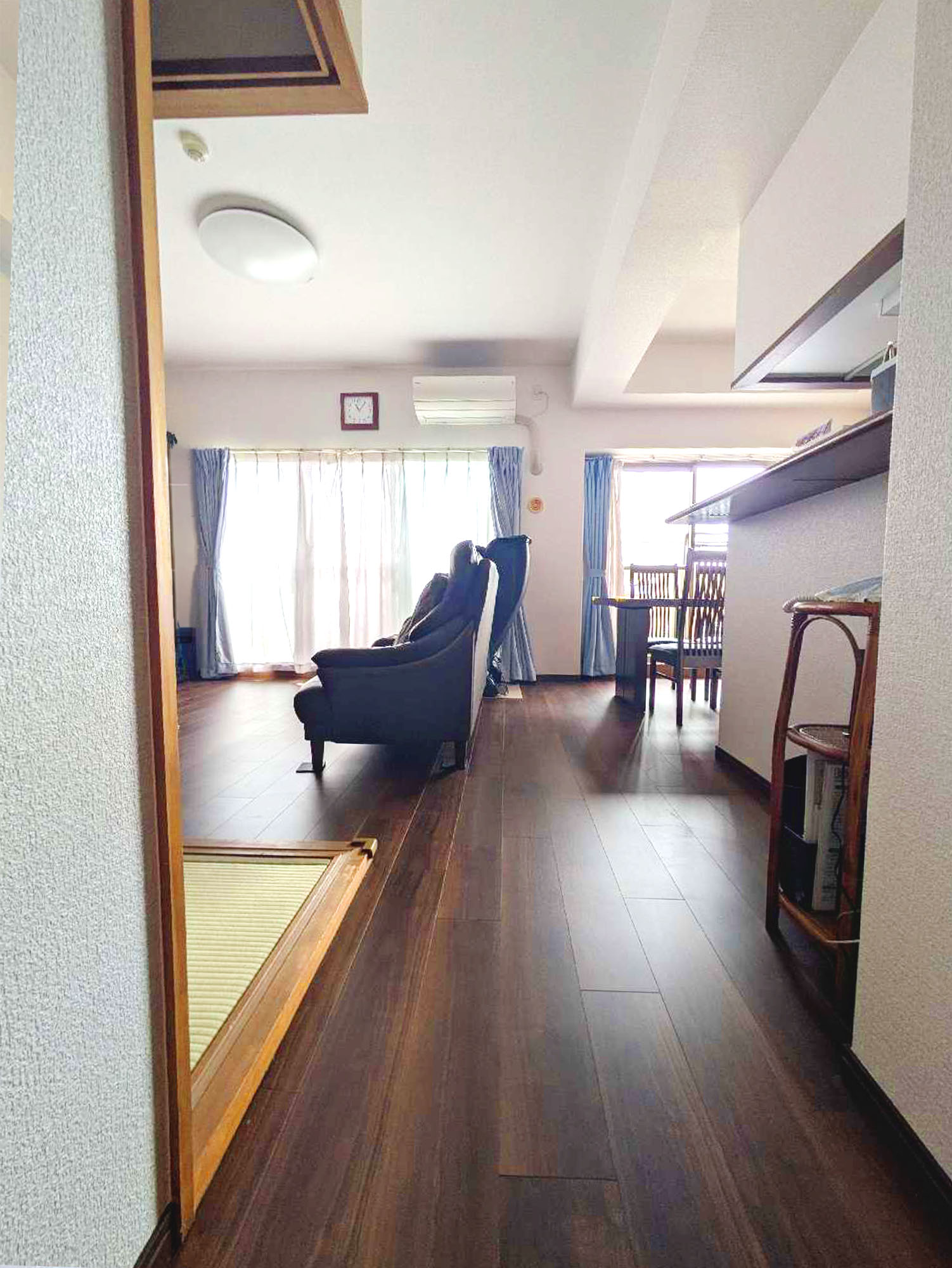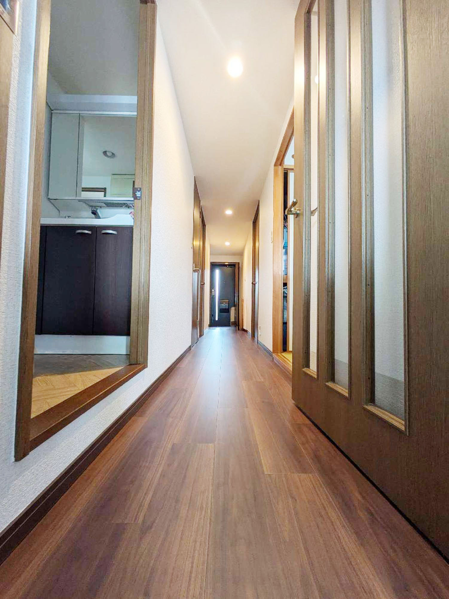 長年の日焼けや家具の跡が気になっていたマンションの床と壁をリフォーム。 マンション特有の遮音性能を備えつつも温もりを感じるフローリングを採用。 既存の建具と色味を丁寧に合わせることで、廊下からリビング、各居室まで住まい全体に美しい統一感が生まれました。 清潔感あふれる新しい壁紙との相性も抜群で、日々の暮らしがより明るく、心地よいものへと生まれ変わりました。