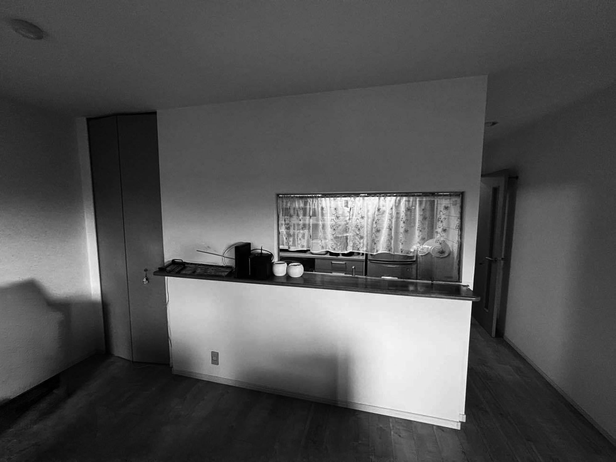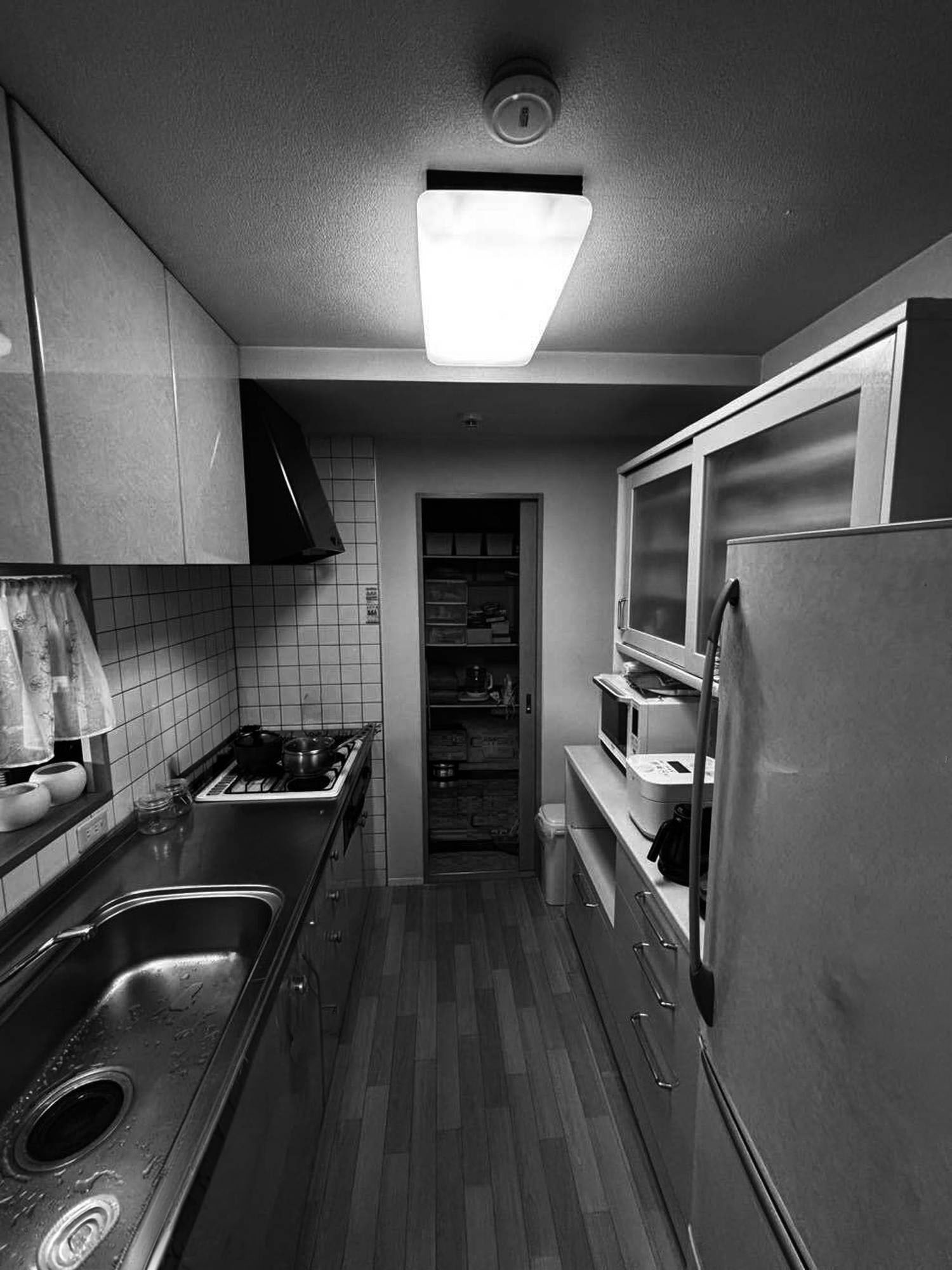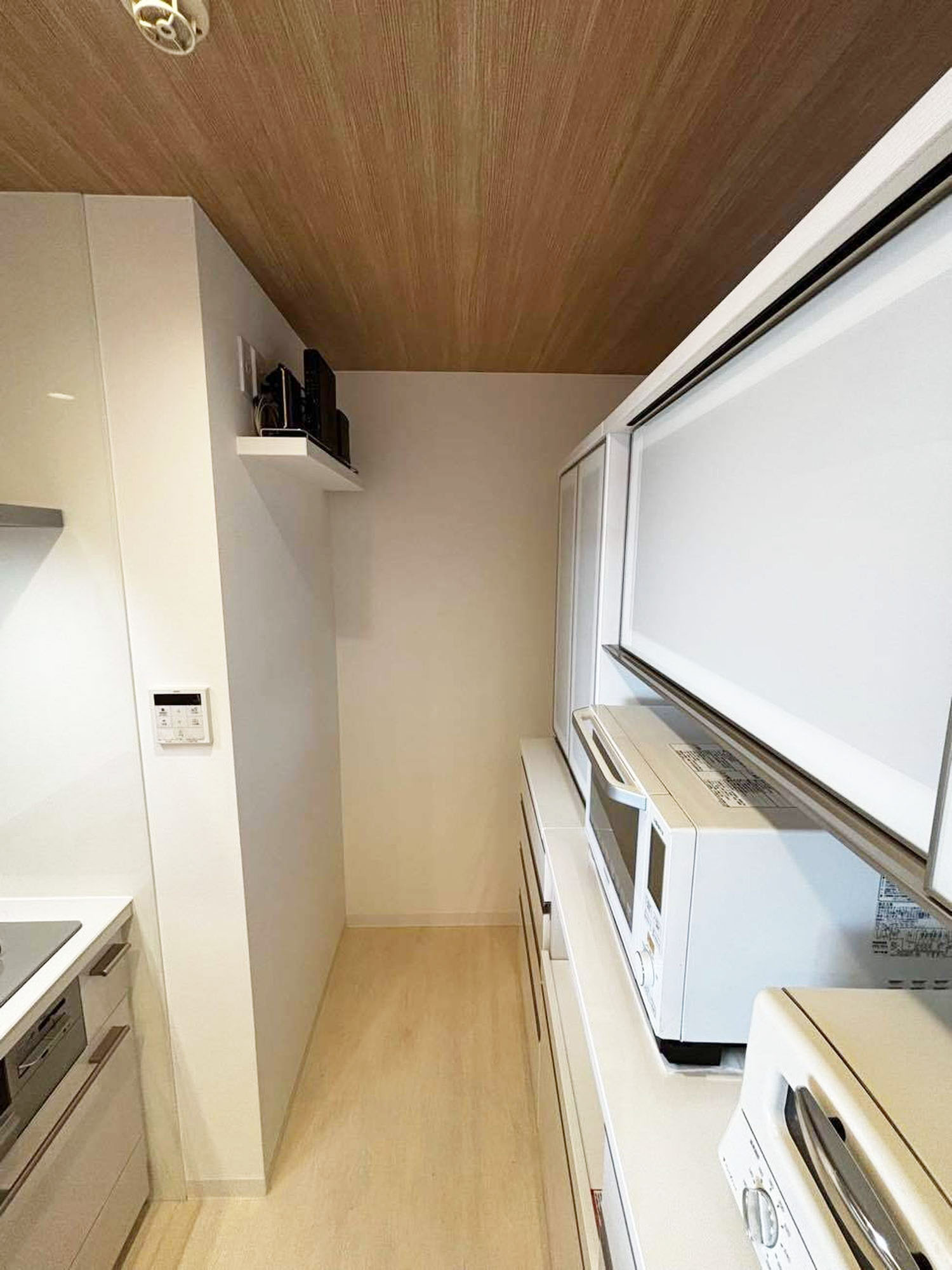 キッチン横の物入 (パントリー) を解体し、キッチンスペースを拡張しました。レンジフードの部分だけ天井が下がっていたため、物入 (パントリー) を含め、全体に下がり天井を造作し、フラットな天井にしました。天井は10㎝程度下がりましたが、ダウンライトを新設することにより、圧迫感を軽減しました。