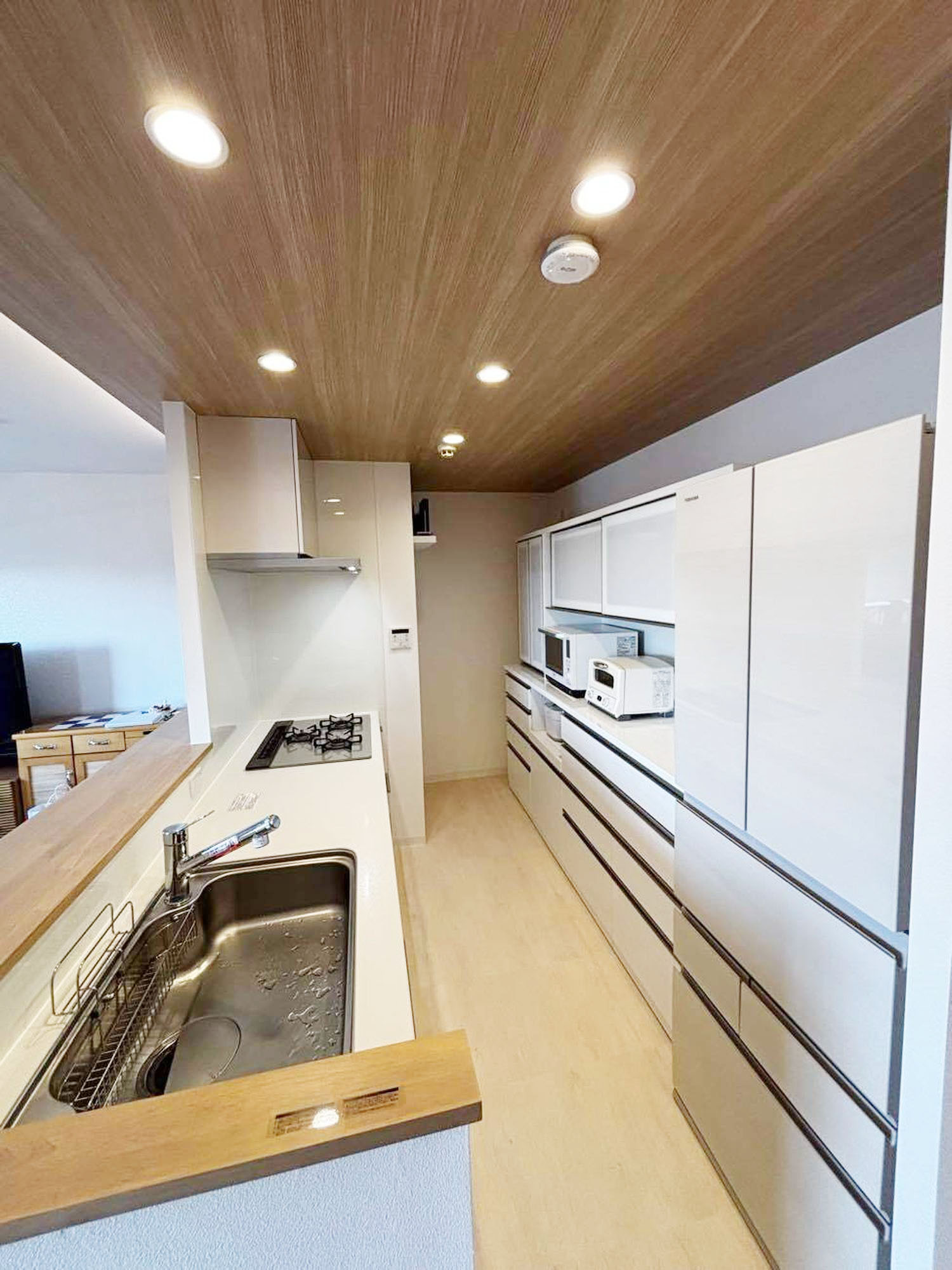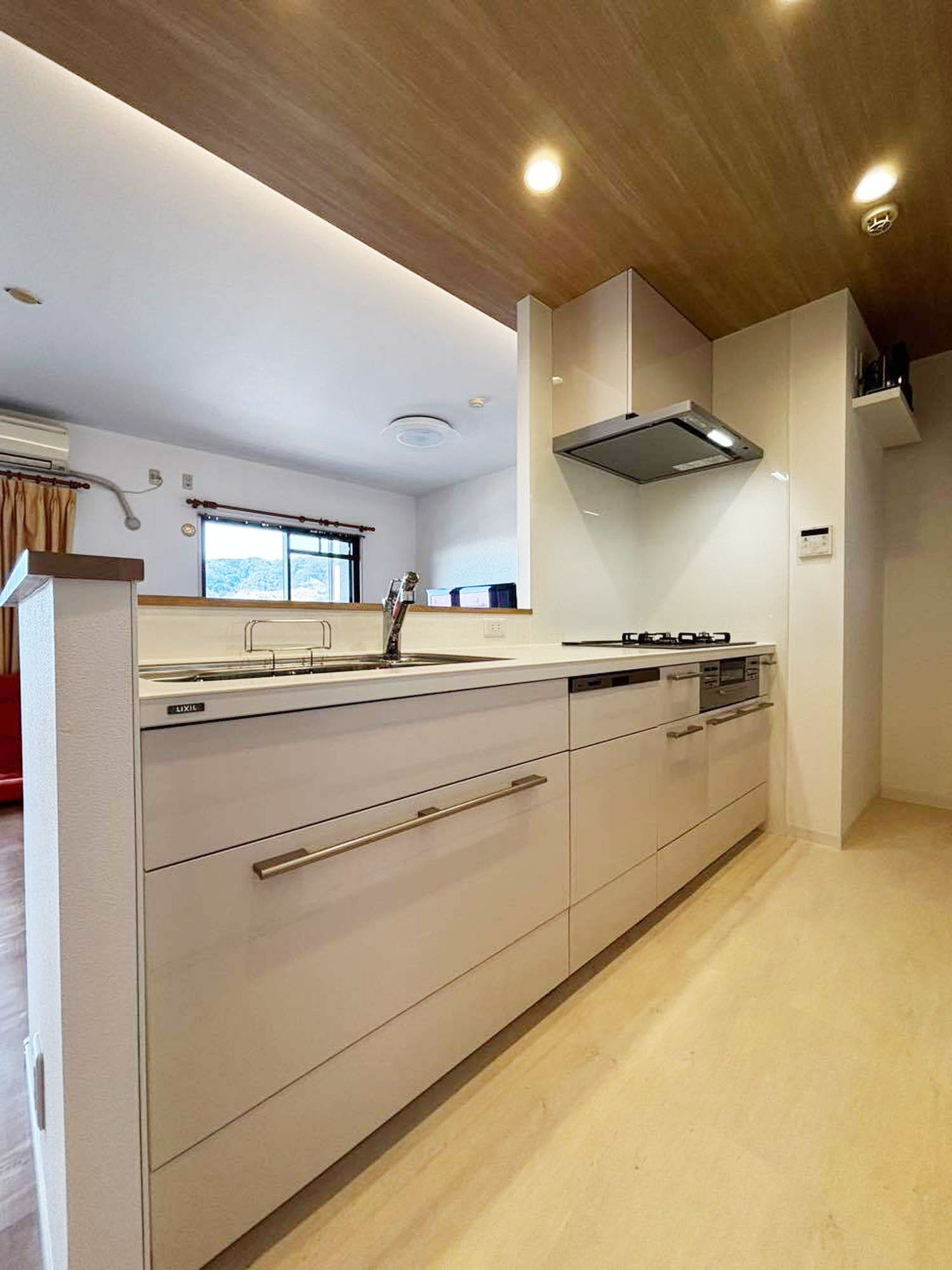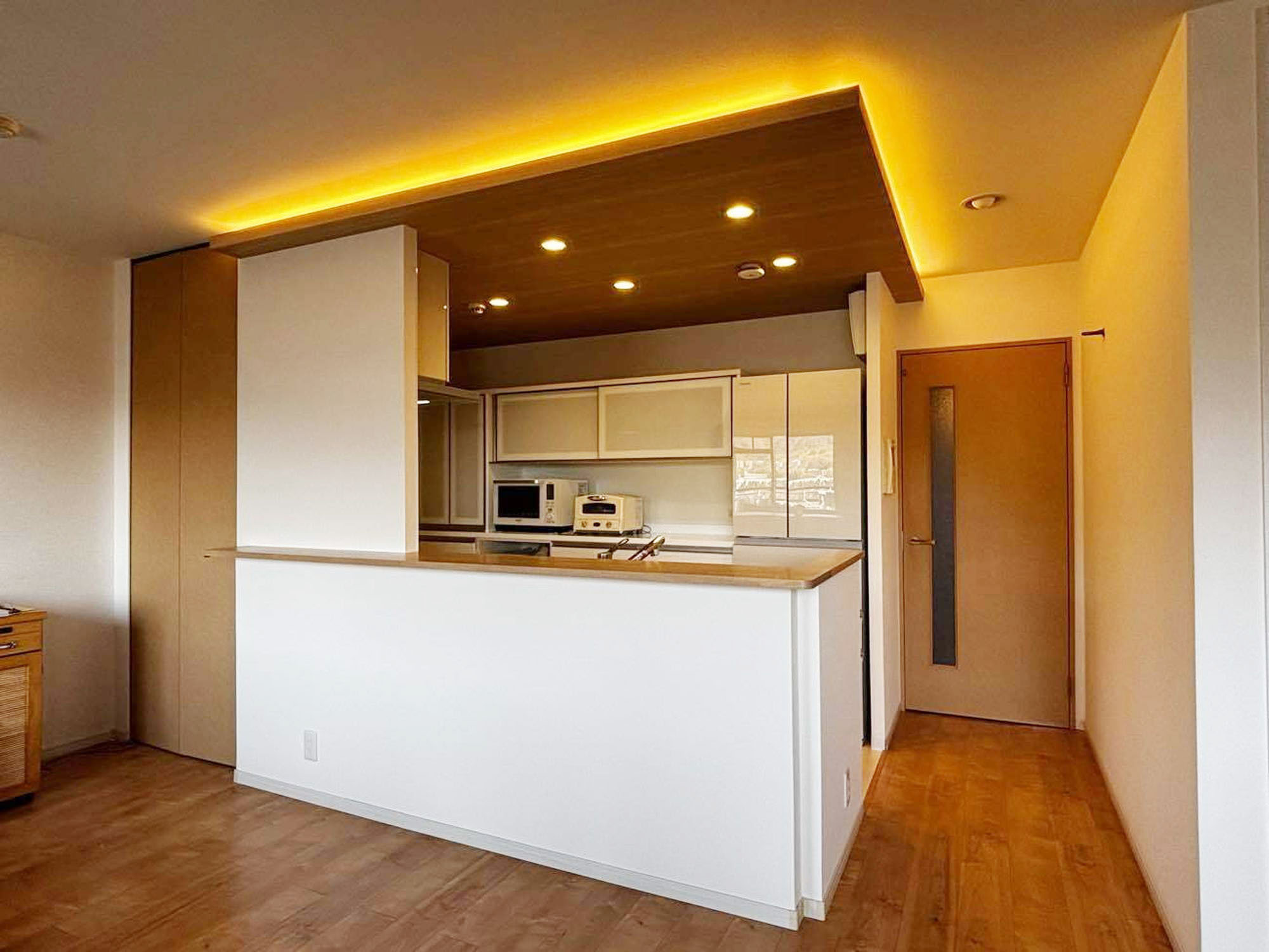 | 担当者からのひとこと | 長きにわたるお付き合いをさせていただいている施主様より、リフォームのご相談をいただきました。今回施工させていただきましたお家の最大の特徴は、リビングからキッチンまで続く、木目調の下がり天井と間接照明です。温かみのある木目と柔らかな光が、お部屋全体に落ち着きと上質さをプラス。デザイン性と機能性を兼ね備えた、こだわりの空間となりました。