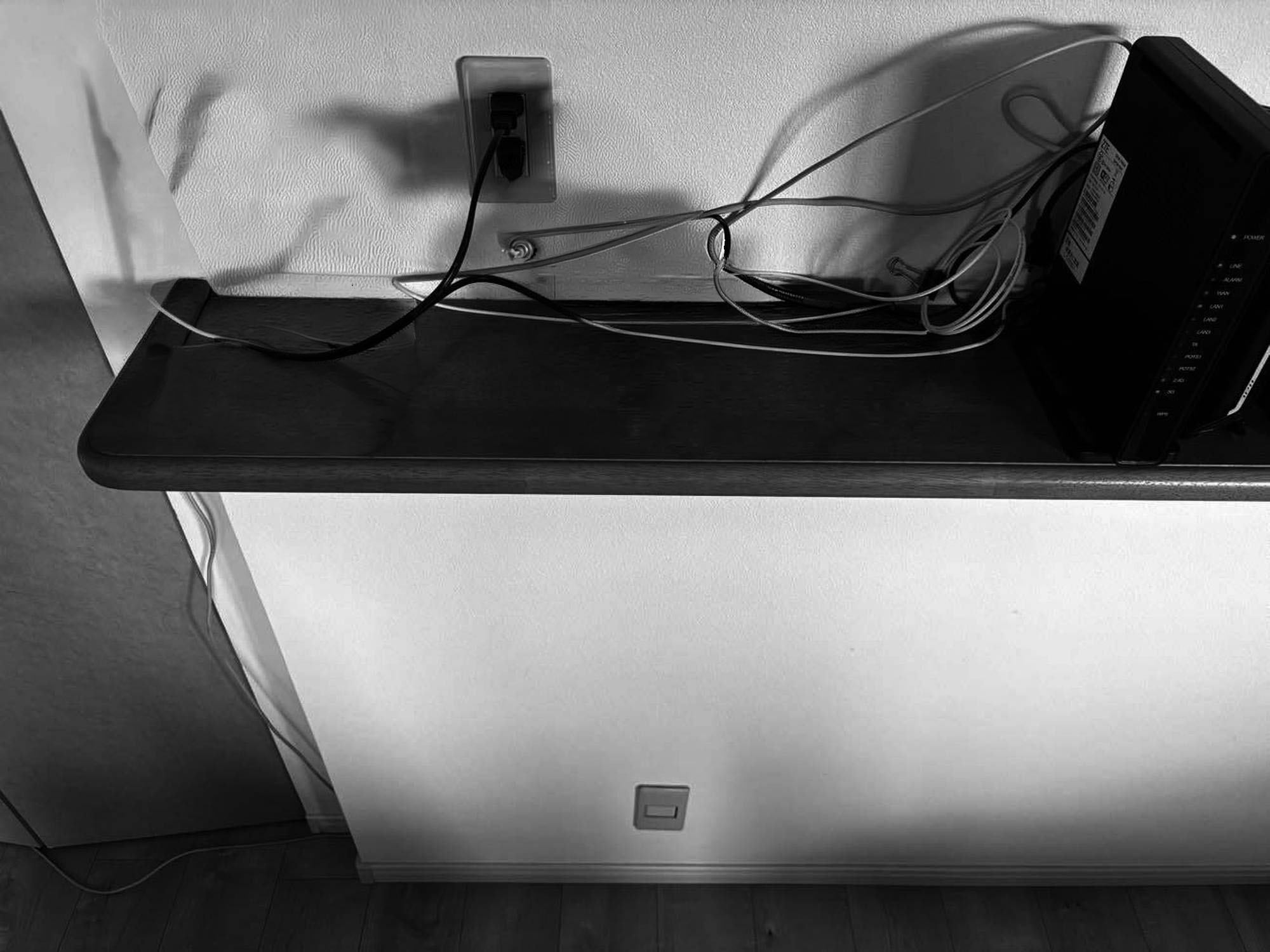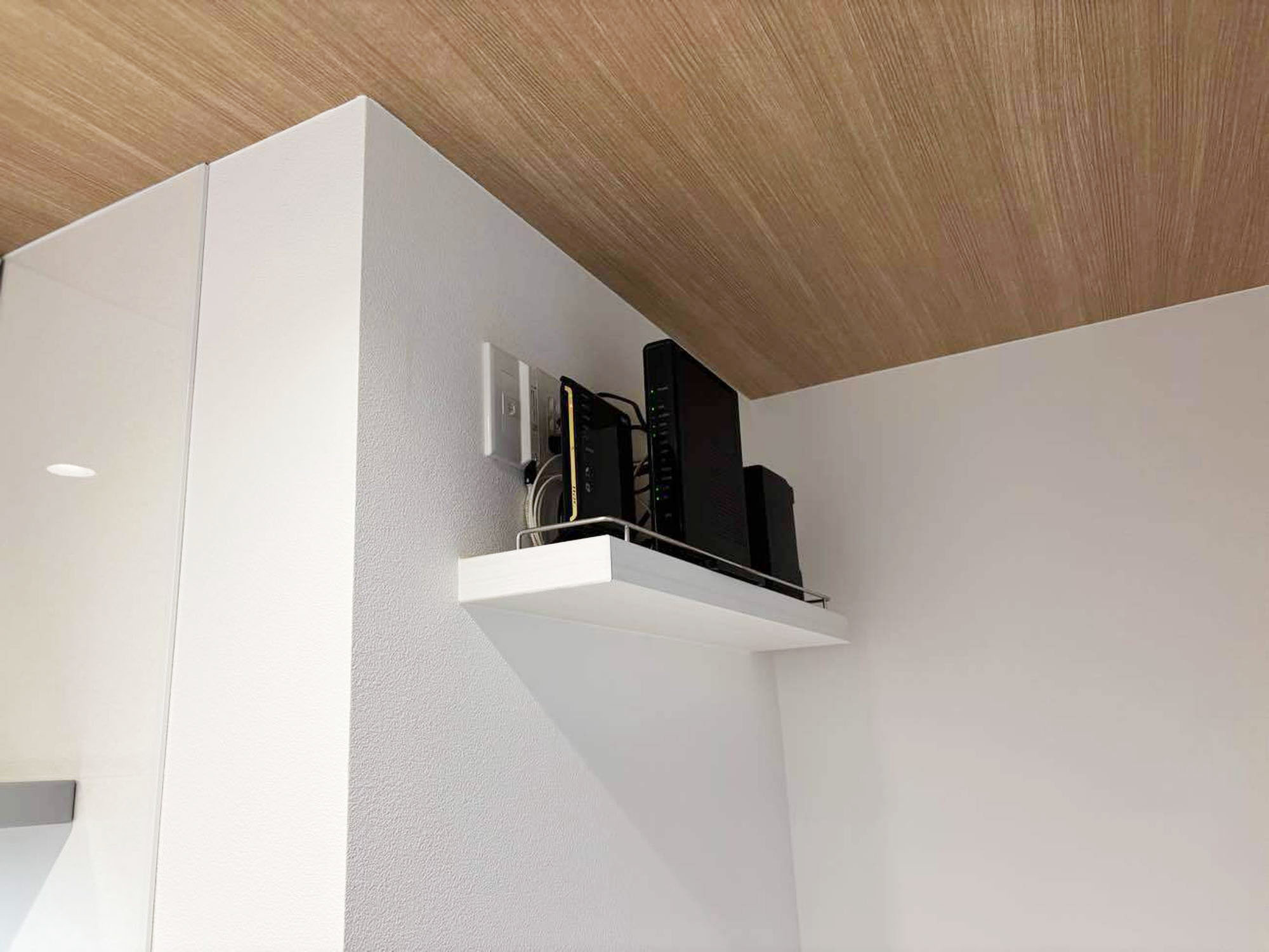 元々キッチンカウンターの上にモデム・ルーター置き場がありましたが、物入 (パントリー) の壁面上部に棚を設置し、リビングダイニングから見えないようにしました。