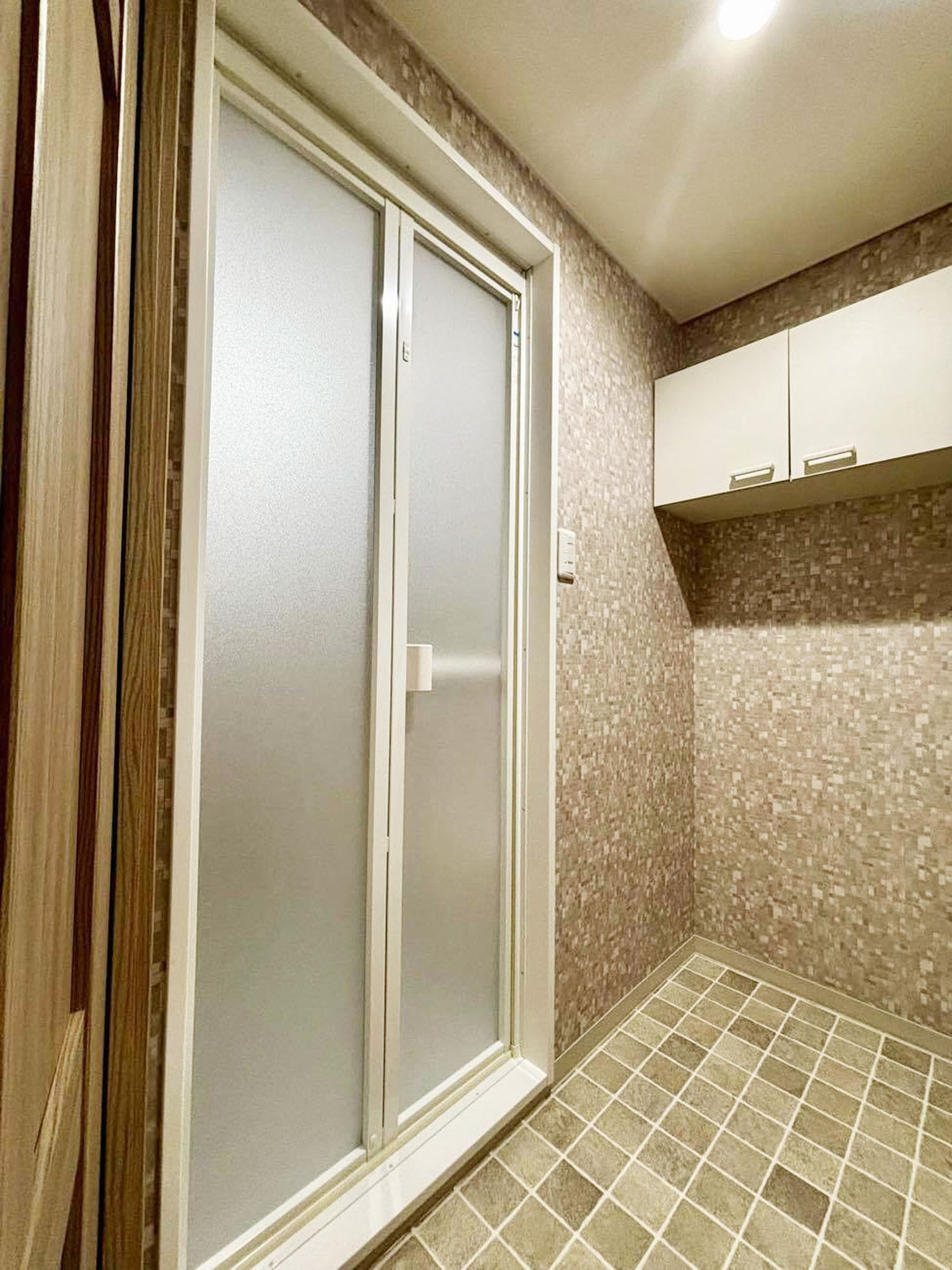 『工事完了』。タイル目の床+壁紙にチェンジ!空間がお洒落に生まれ変わりました。