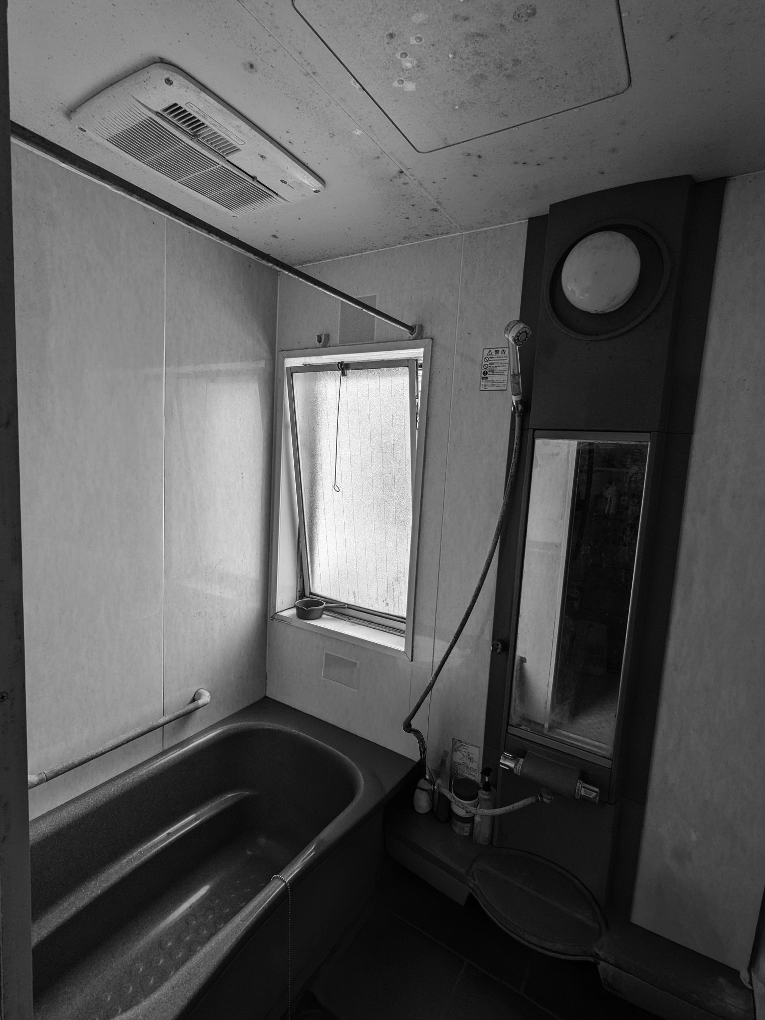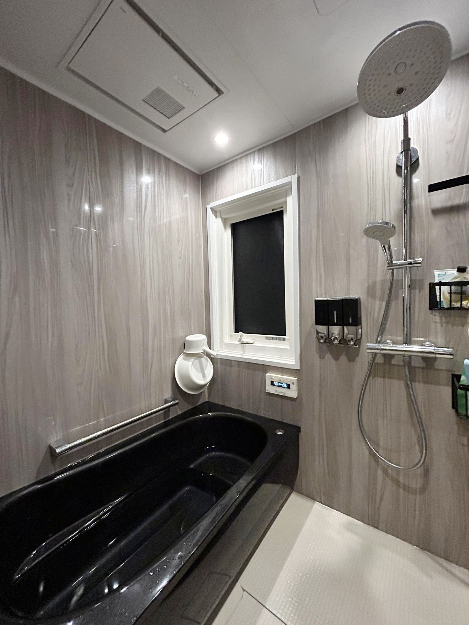 『工事完了』。最新のお風呂にチェンジ!ブラックの浴槽とグレー木目調がスタイリッシュを際立たせています。