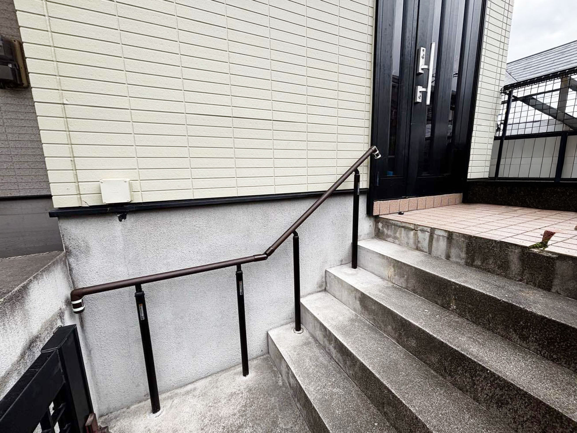 『工事完了』。ブラックテイストの手すりを新設しました。玄関カラーと統一されスタイリッシュに。