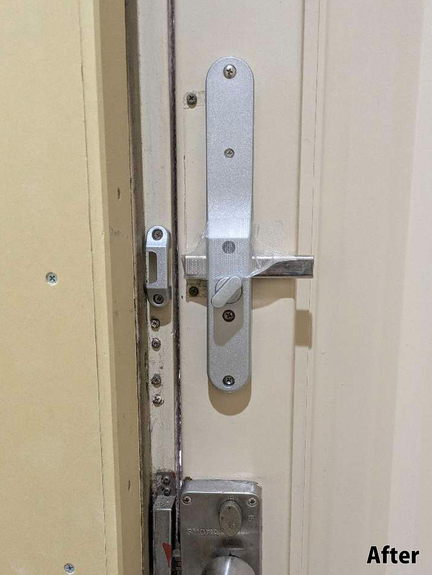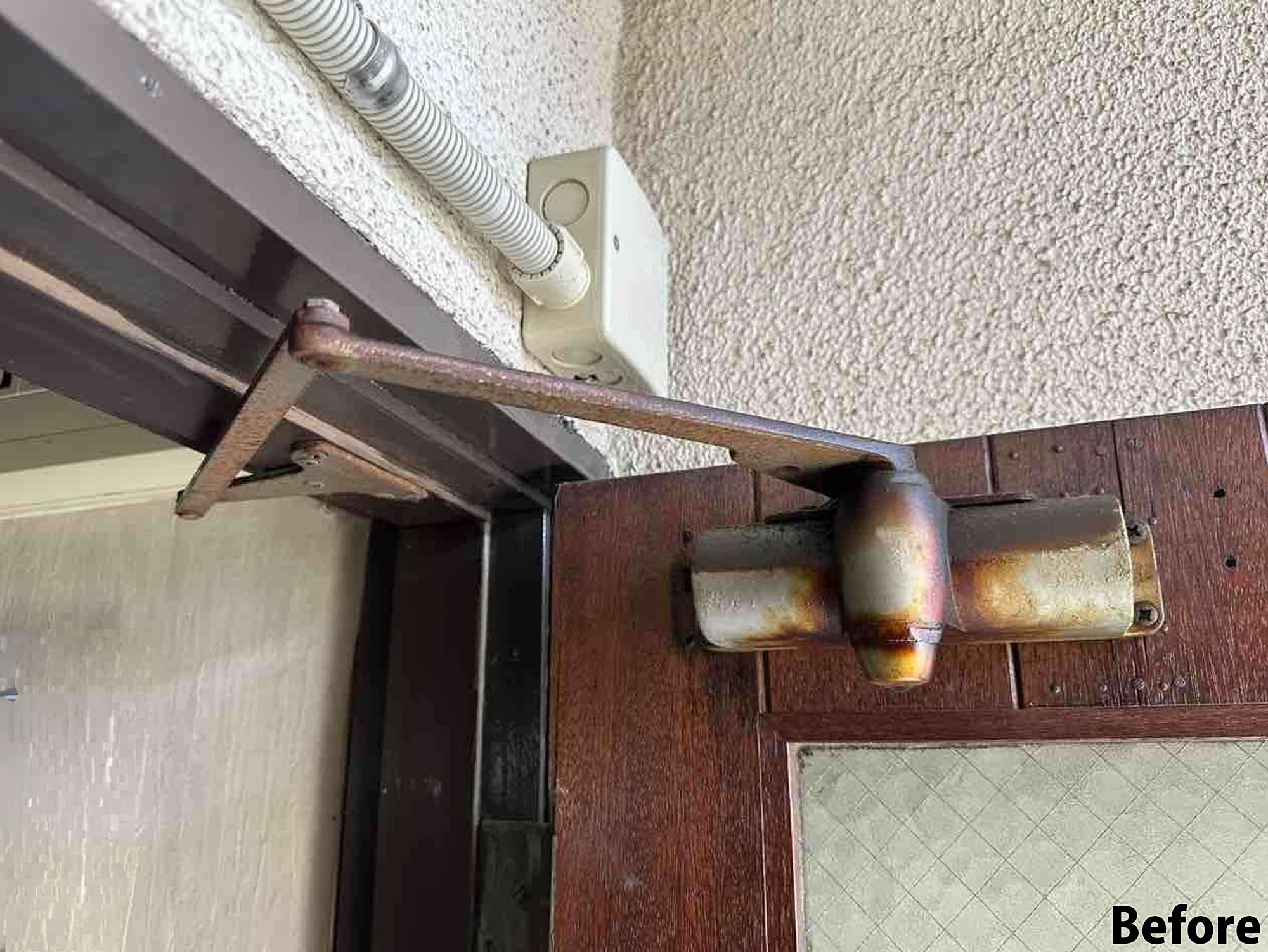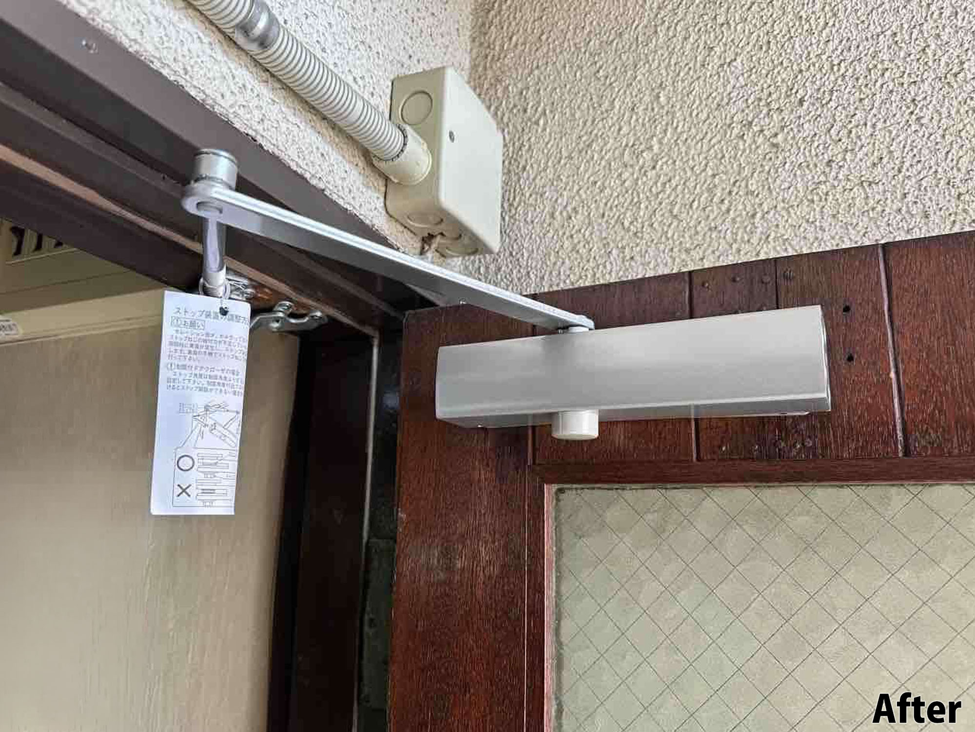古くなったドアクローザーの交換工事を行いました。建付けの悪さも同時に解消するため、丁番の調整や扉の下部をカットすることで、スムーズな開閉が蘇りました。お客様からは「ドアが軽くなった!」と大変喜んでいただけました。