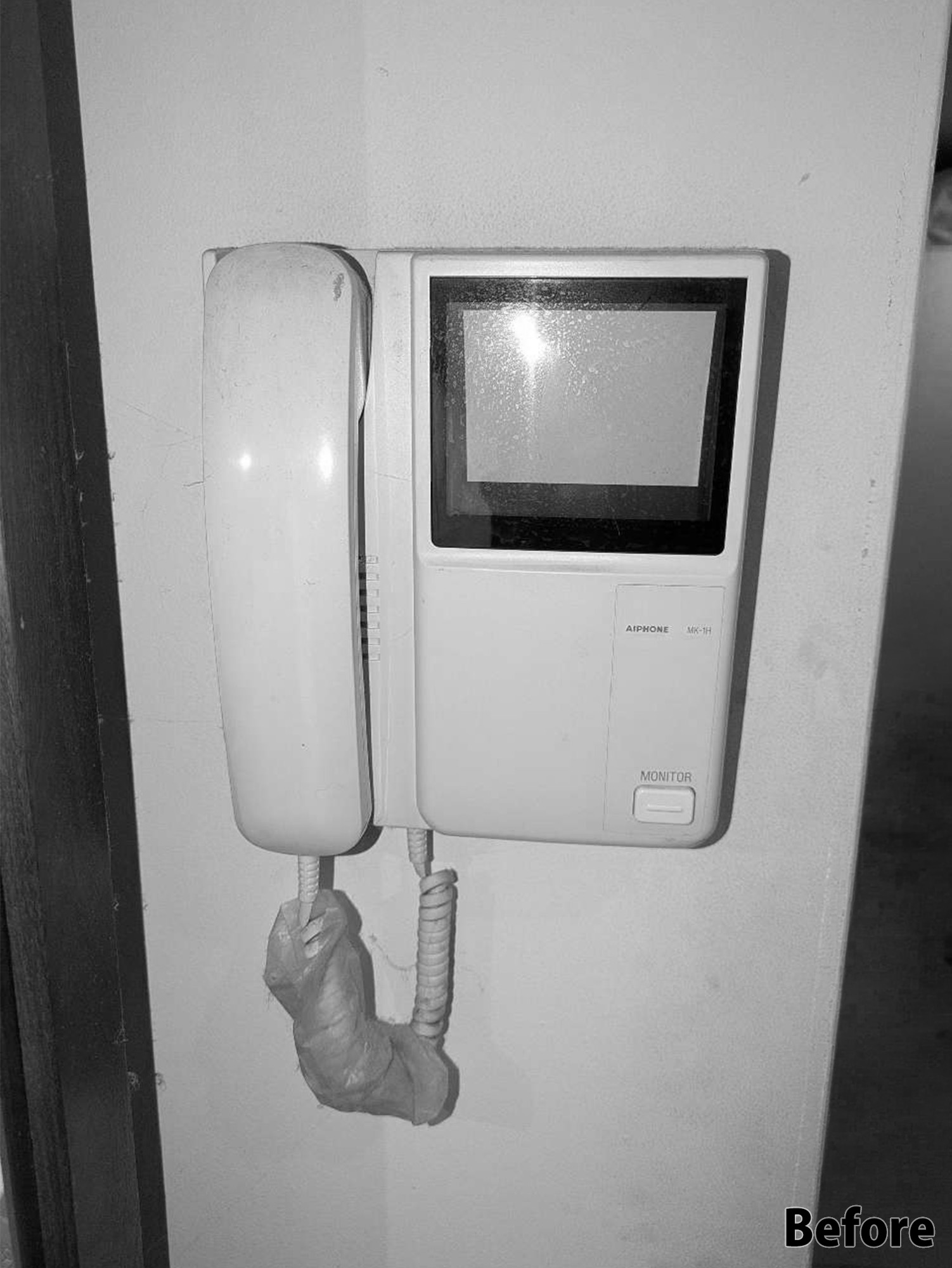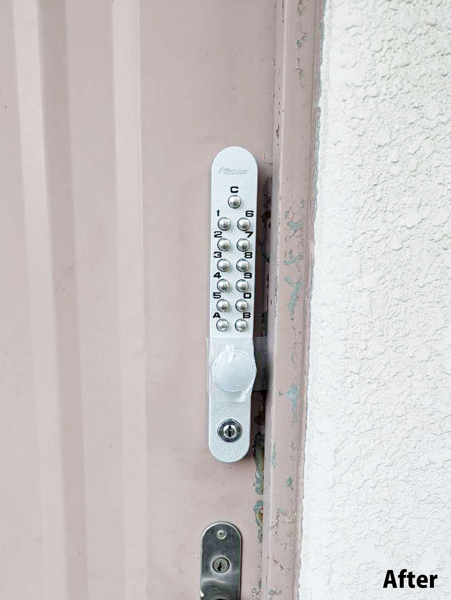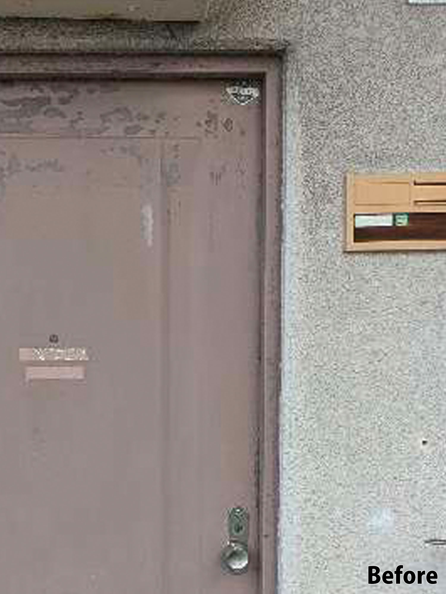 古くなったマンションの玄関ドア。今回は、既存のドアを活かし、便利な暗証番号式のキーを後付けしました。これからは鍵要らずで、ご家族皆様が安心して快適に過ごせます。