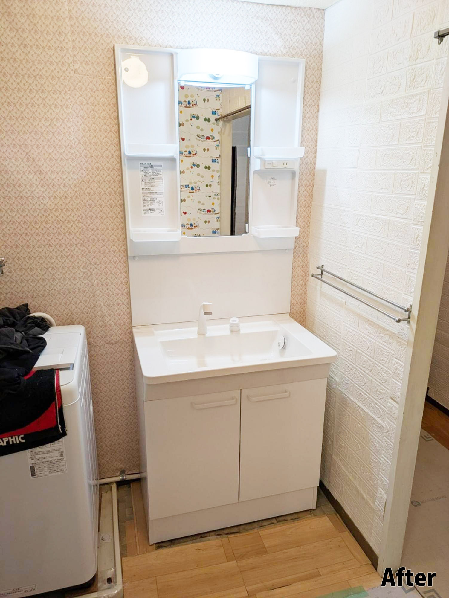 長年大切に使われた洗面台を、お手入れしやすく明るい空間へ。使いやすさにこだわった洗面化粧台となりました。毎日の身支度がパッと明るく、広々としたボウルで朝の準備もスムーズです。