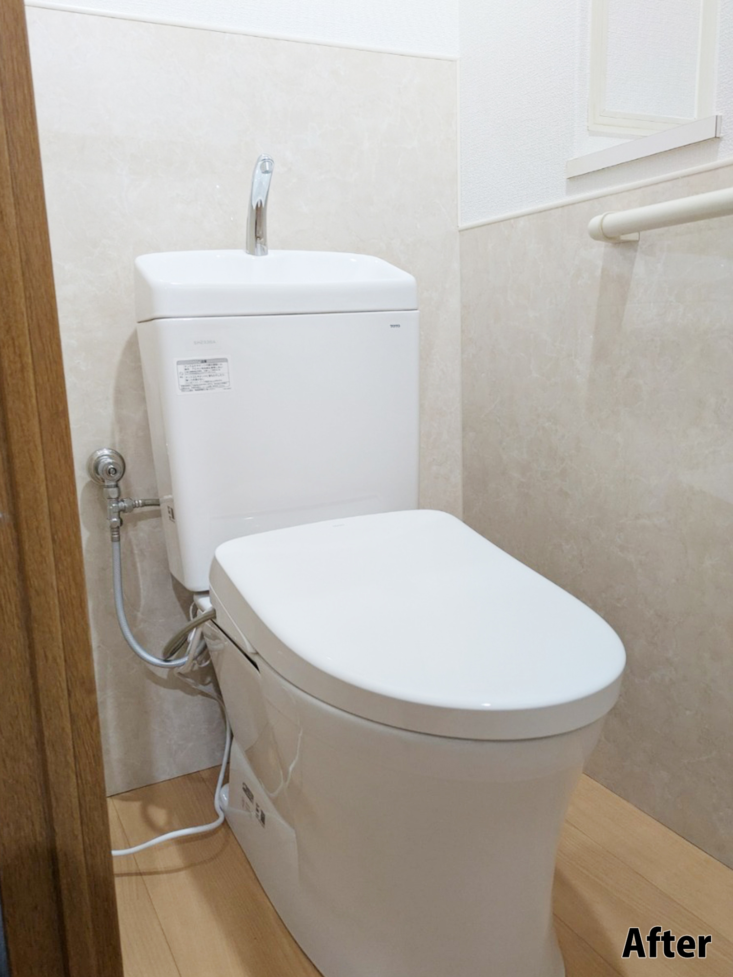 狭さや配管が悩みだったトイレ。マンション専用モデルで空間を広げ、木目調の内装で温かい安心感をプラス。マンション特有の構造による「設置の難しさ」も、見えない配管部分の処理まで職人がこだわり抜きました。