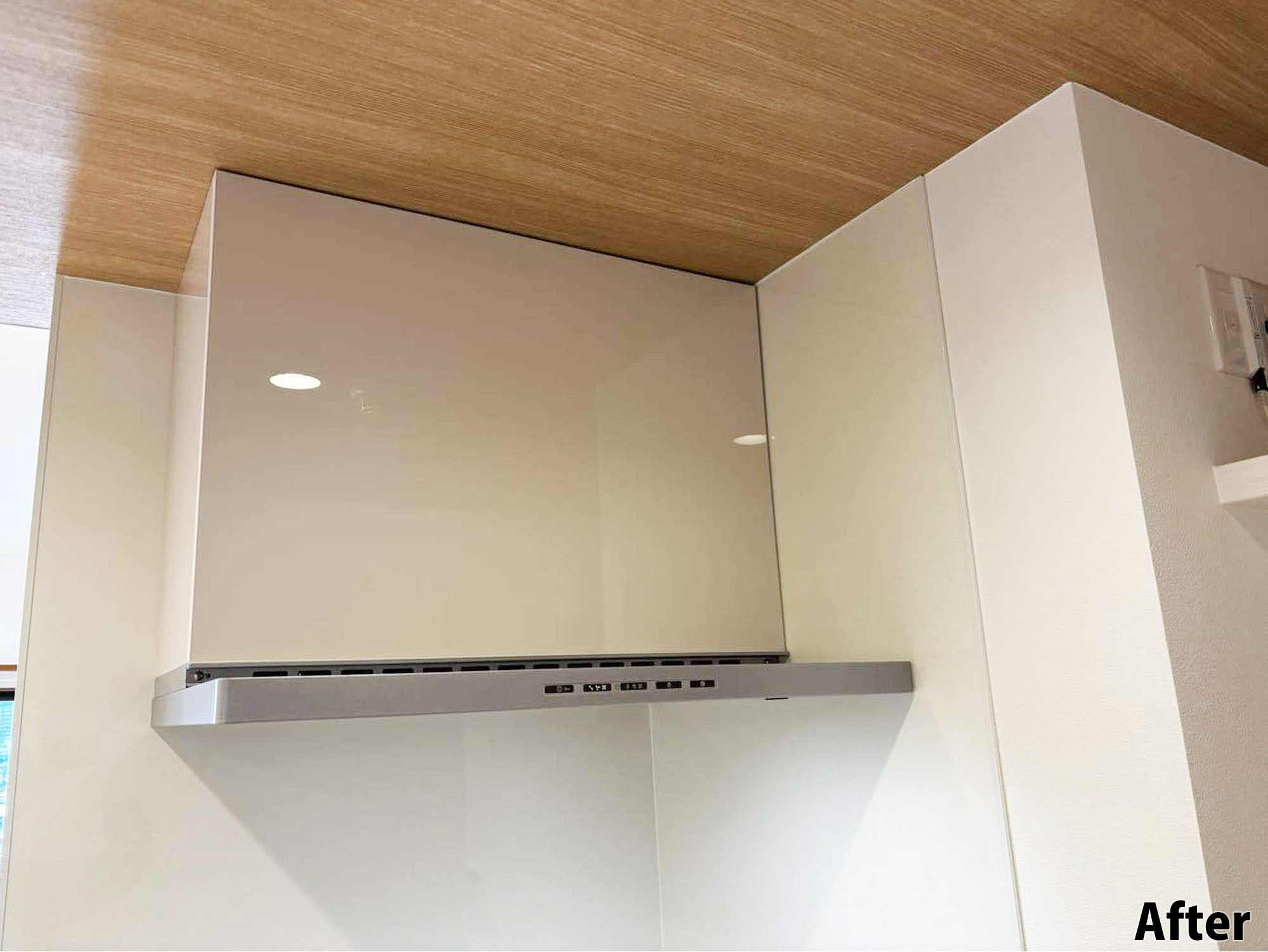 長年使ったレンジフードを一新。将来のコンロ交換も見据え、ガスコンロ連動タイプへ交換。面倒な掃除から解放され、キッチンに立つ時間がもっと楽しみになるお手伝いが出来ました。