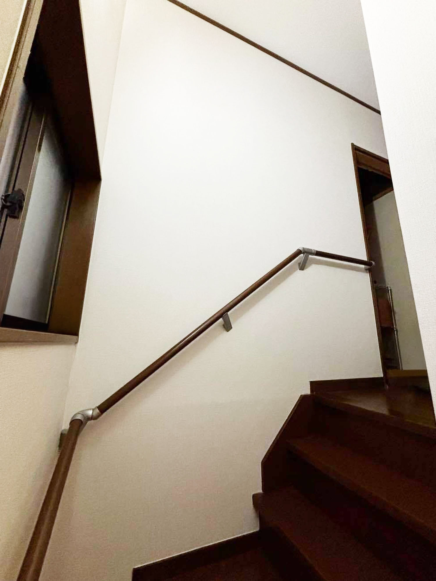 『工事完了』。ダークブラウンテイストの手すりを新設しました。階段・建具カラーと統一されスタイリッシュに。