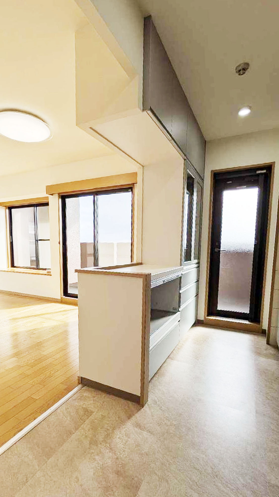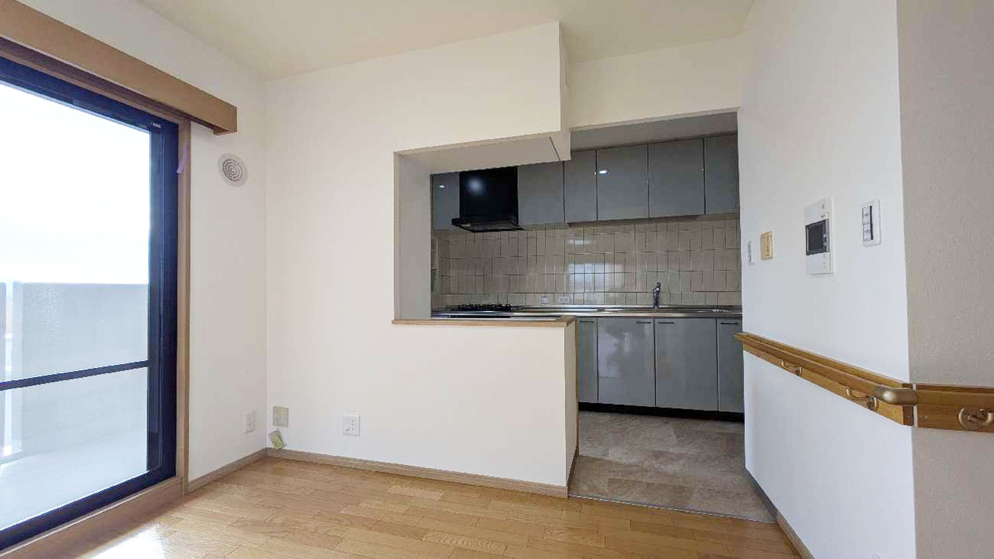『工事完了』。カップボードを新たに設置し、対面壁に開口を開けました。開放感と利便性を両立しました。