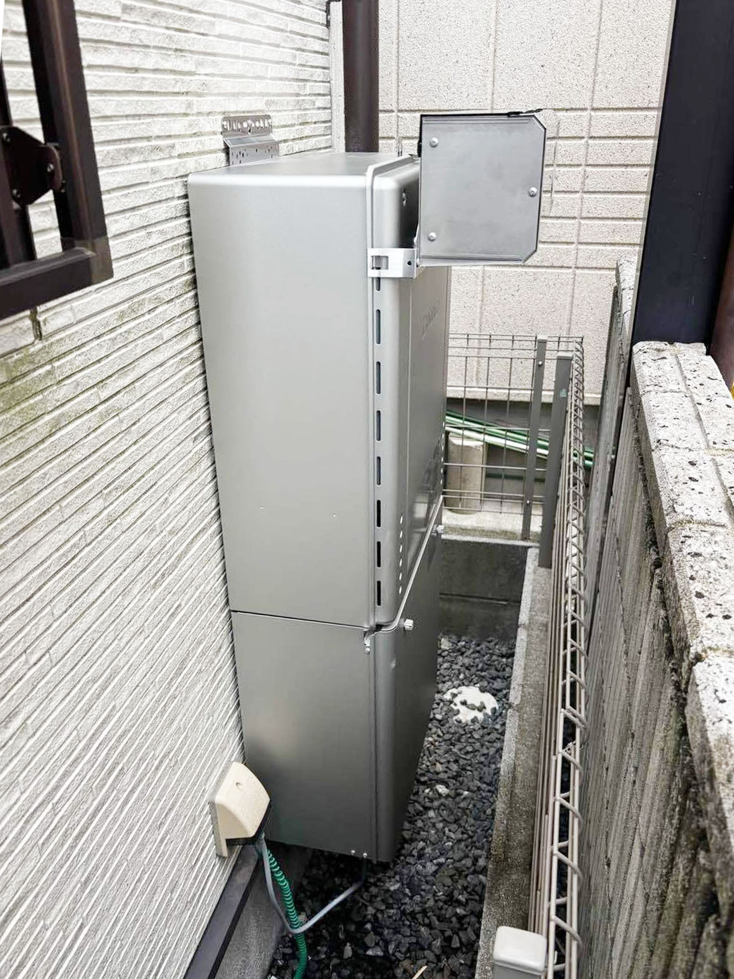 『給湯器工事』です。周辺を汚さず、キレイな状態で工事をさせていただきます。